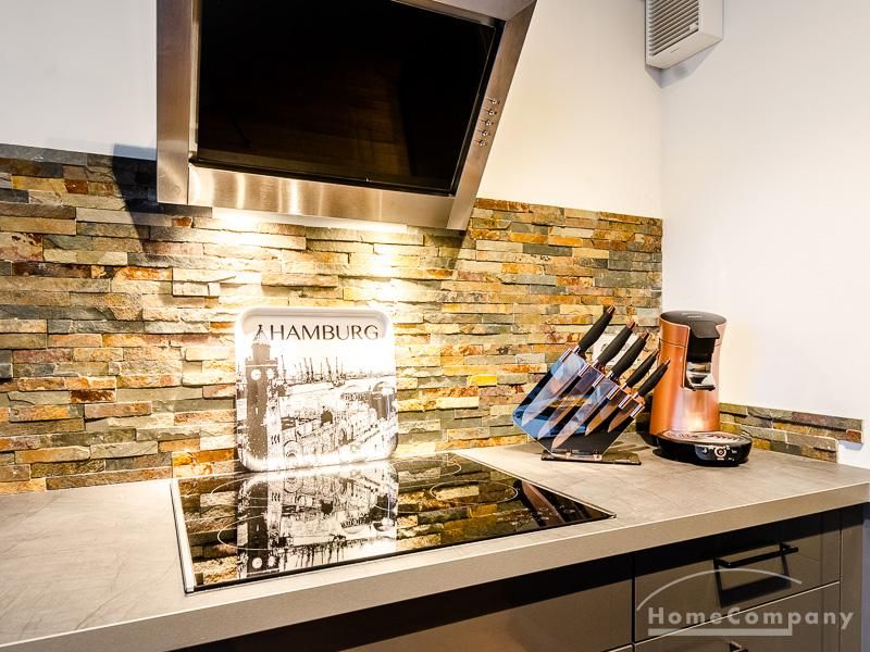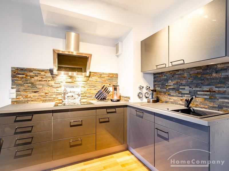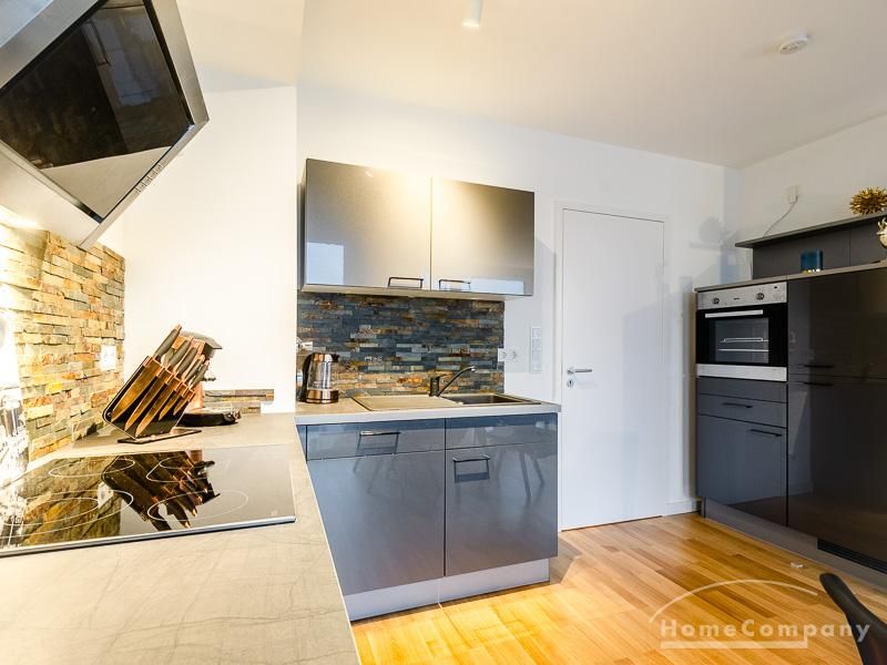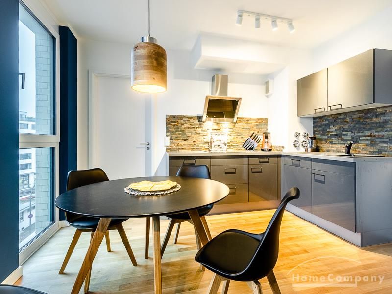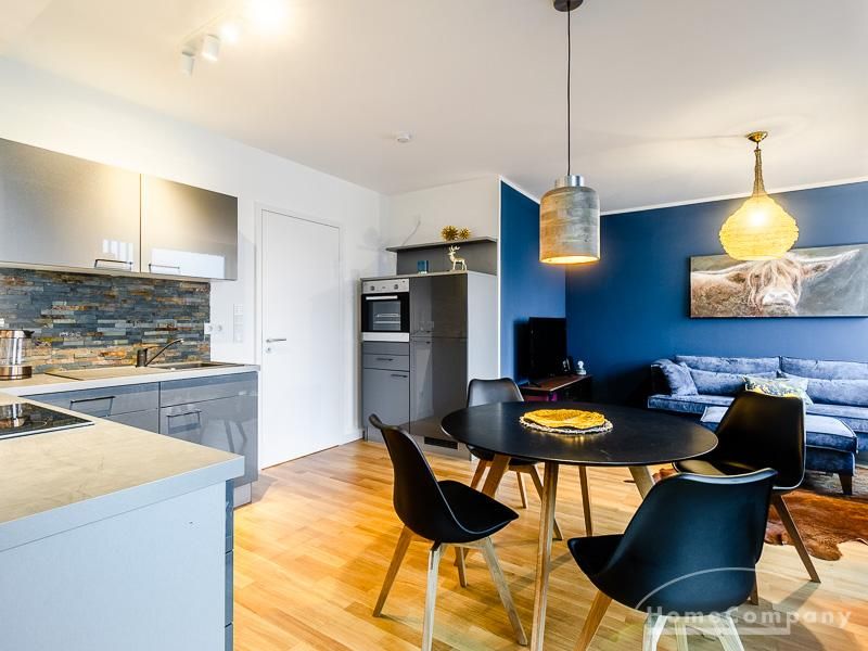 Die Hochglanz grauen Fronten der offenen Küche stehen im bewussten Kontrast zu den Griffen aus echten Lederriemen. Der Fliesenspiegel ist aus Natursteinriemchen hergestellt. Ein runder Esstisch mit 4 Stühlen bildet den Übergang zum Wohnbereich mit den blauen Polstermöbeln und einem 50 Zoll TV (Magenta home). 400 MBit schnelles Internet steht ebenso zur Verfügung wie eine in allen Räumen nutzbare Bluetooth Musikanlage.
