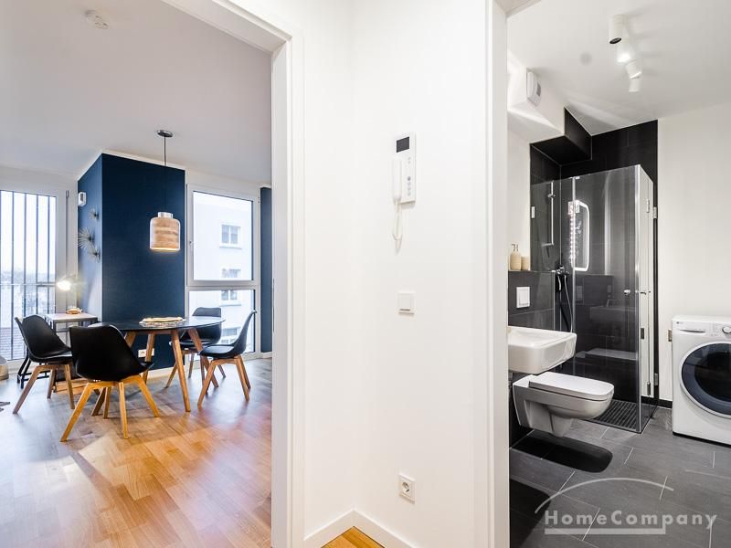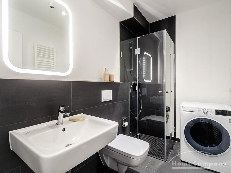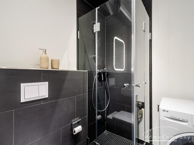 Im modernen Dusch-Badezimmer steht ein Waschtrockner als Kombigerät zur Verfügung.