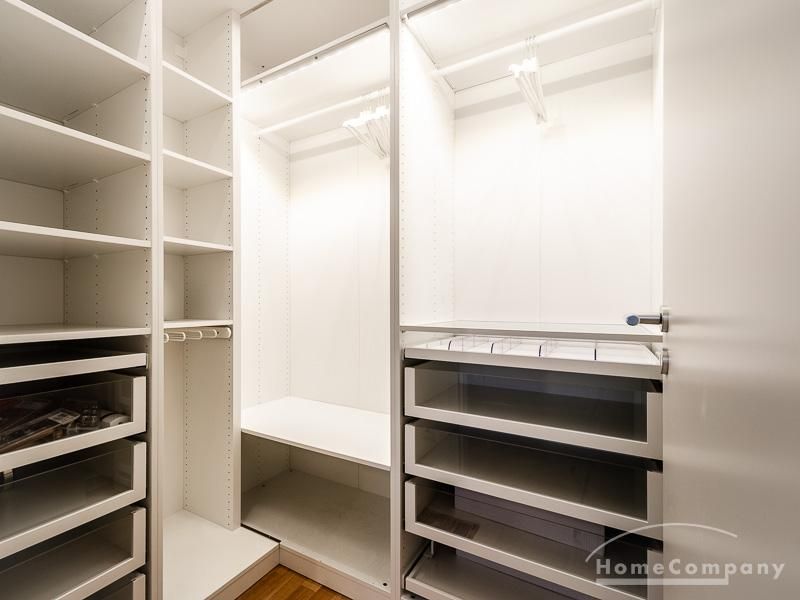Direkt an das mit eine 1,80 breiten Doppelbett eingerichtete Schlafzimmer grenzt ein begehbarer Kleiderschrank mit perfekter Ausstattung mit zahlreichen Stangen, Regalen, Auszügen und Fächern jeder Größenordnung. Hier steht wirklich für jedes Stück der richtige Platz bereit.