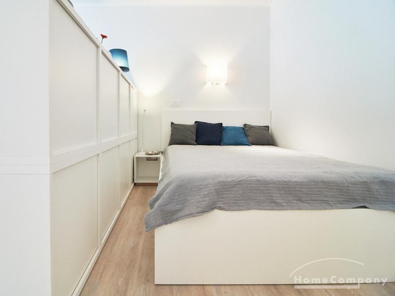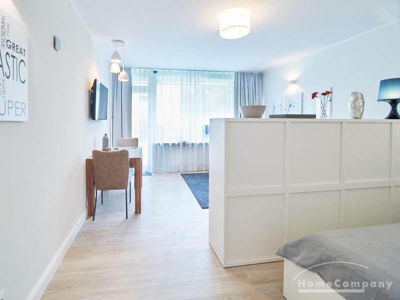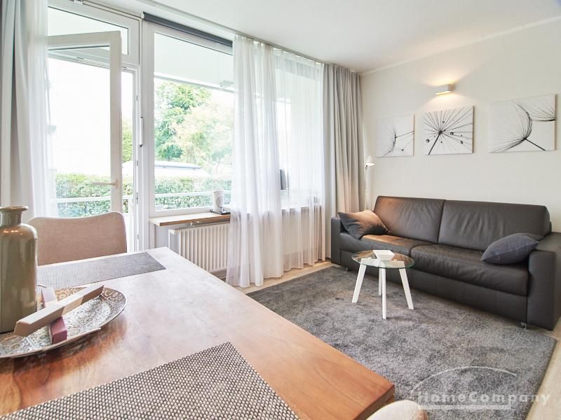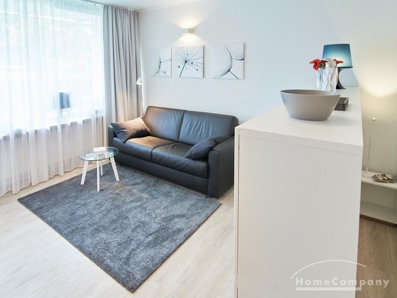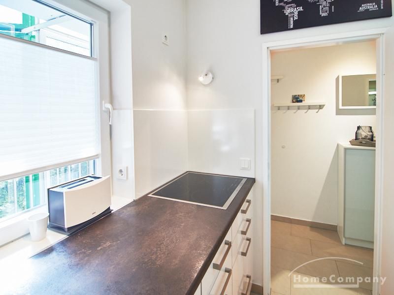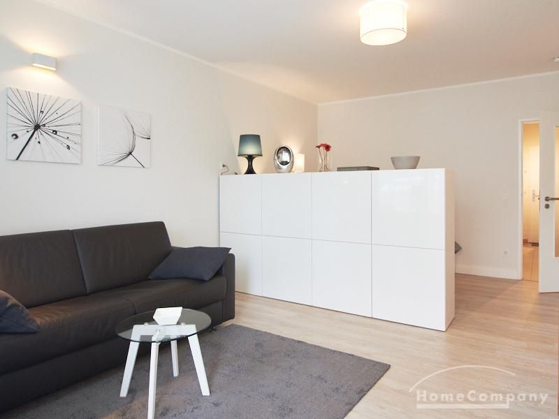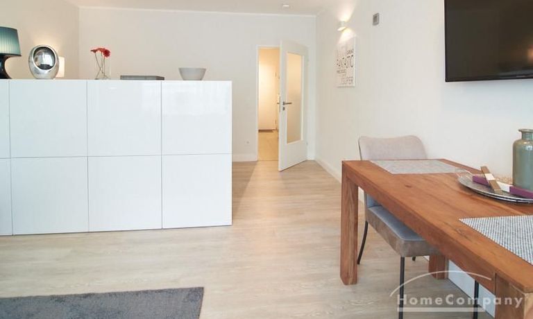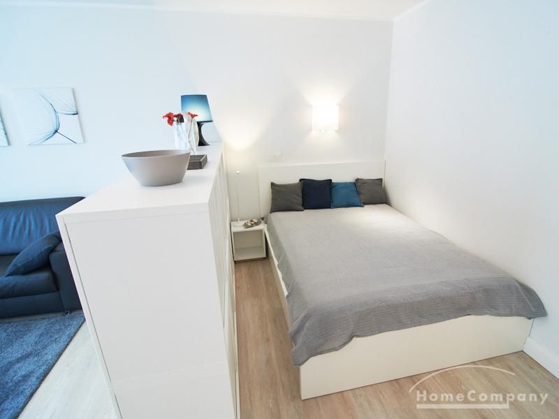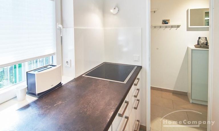 1-Zimmer-Apartment im Hochparterre in einer ruhigen Seitenstraße in Eimsbüttel. Die Wohnräume sind mit einem ansprechenden und pflegeleichten Designboden versehen. Das helle und freundliche Wohnzimmer ist durch einen Raumteiler, der reichlich Stauraum bietet, in einen Wohnbereich und einen mit einem 1,40 breiten Bett ausgestatteten Schlafbereich separiert. Der Wohnbereich ist sehr geschmackvoll und modern eingerichtet. Ein hochwertiges Leder-Bettsofa (separate Matratze) steht hier als Gästebett zur Verfügung. Von dem gemütlichen Wohnbereich gelangt man auf den großzügigen Balkon. Die hochwertige Einbauküche ist neben Geschirrspüler und Induktionsherd mit einem detailliert programmierbaren Backofen ausgestattet. In die Wand zwischen Bad und Küche ist im oberen Bereich ein Lichtfeld integriert. Im schönen Bad befindet sich eine halbrunde Dusche mit Glasabtrennung. Im Flur bietet ein geräumiger Einbaukleiderschrank reichlich Platz für die Garderobe.