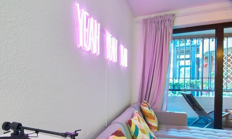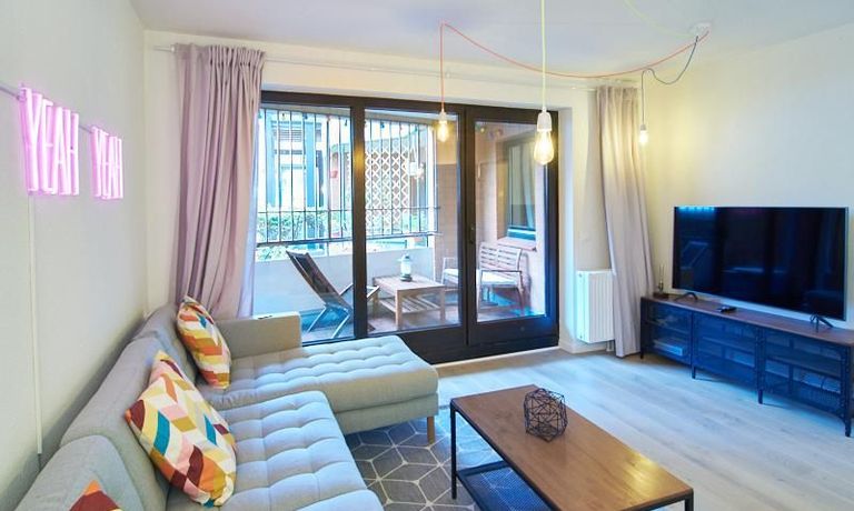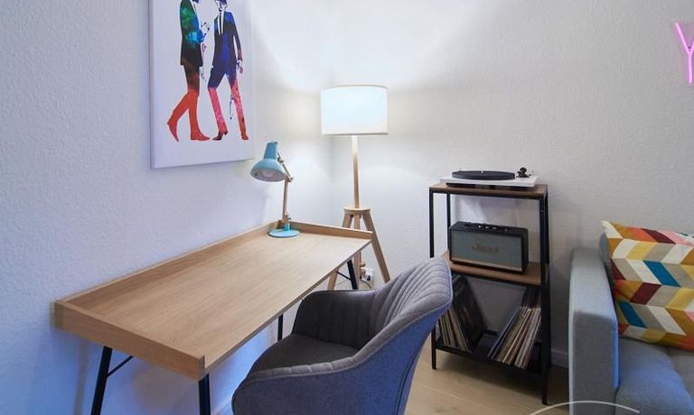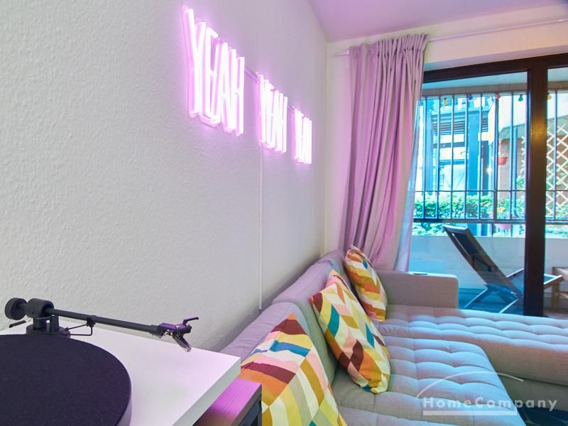 Vom Wohnbereich aus gelangt man auf den rückwärtig gelegenen Balkon. Ein 55 Zoll Samsung Smart TV und eine Bluetooth-Musikbox mit Plattenspieler ist eingerichtet.