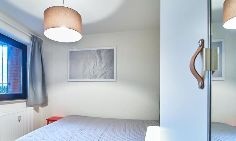 Im gemütlichen Schlafzimmer steht ein 1,60m breites Bett mit Stauraum unter dem Bett und ein gut ausgerüsteter Kleiderschrank zur Verfügung.