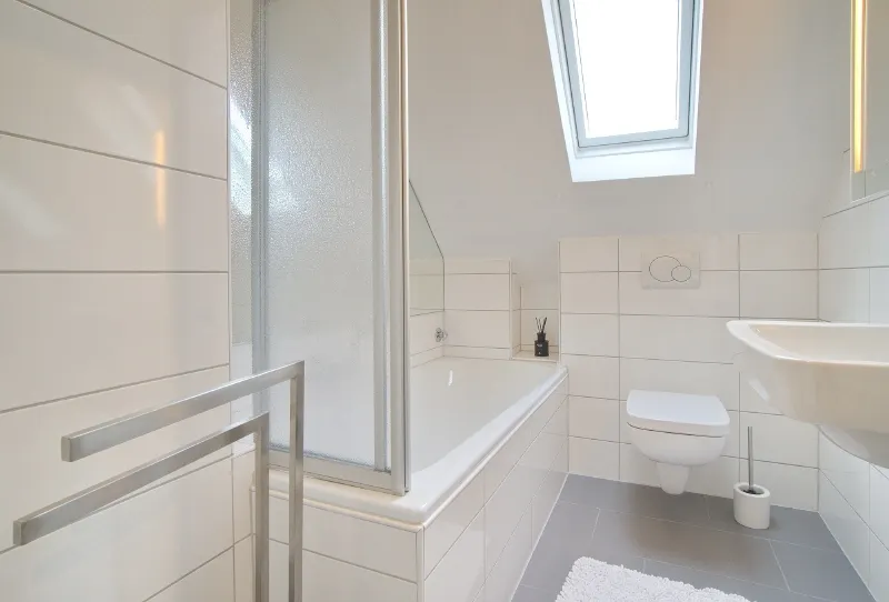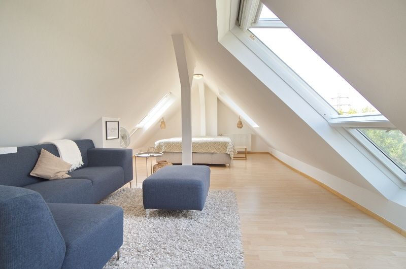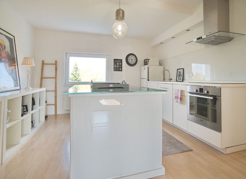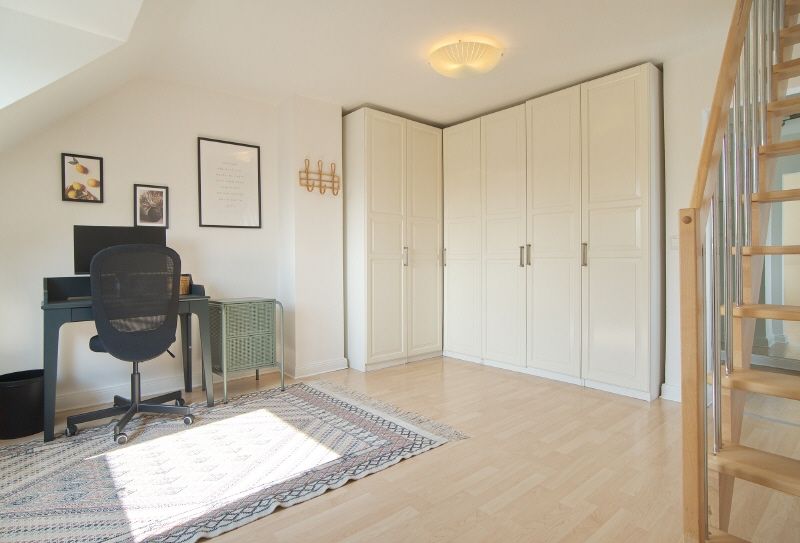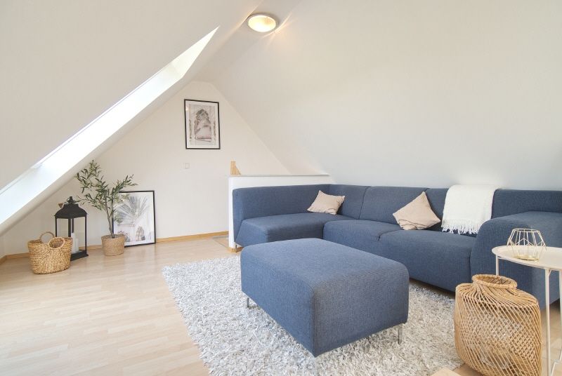 Großzügige und helle Räume, komplette und gehobene Ausstattung inklusive Bettwäsche und Handtüchern sowie Internetzugang (Gastzugang, eigenes Netz). Im unteren Teil der Wohnung liegt der offene Wohnbereich mit Sofaecke, Smart-TV und Esstisch für vier Personen. die Küche schließt sich offen an, hier steht eine Einbauküche mit Spülmaschine, Kühl-Gefrier-Kombination und Herd bereit. Vom Fenster hat man einen Traum-Ausblick ins Grüne. Das Badezimmer ist weiß gefliest, mit Fenster und Handtuchheizung. Gegenüber liegt ein Arbeits- und Ankleideraum mit Schreibtisch und großem Kleiderschrank, hier führt die Treppe nach oben. Der Spitzgiebel ist mit einem 1,80 x 2 m großen Doppelbett und einer Sofaecke möbliert, es gibt Dachflächenfenster zu beiden Seiten. Im Keller des Hauses steht eine Waschmaschine und ein Trockner als Münzgeräte zur Nutzung zur Verfügung.