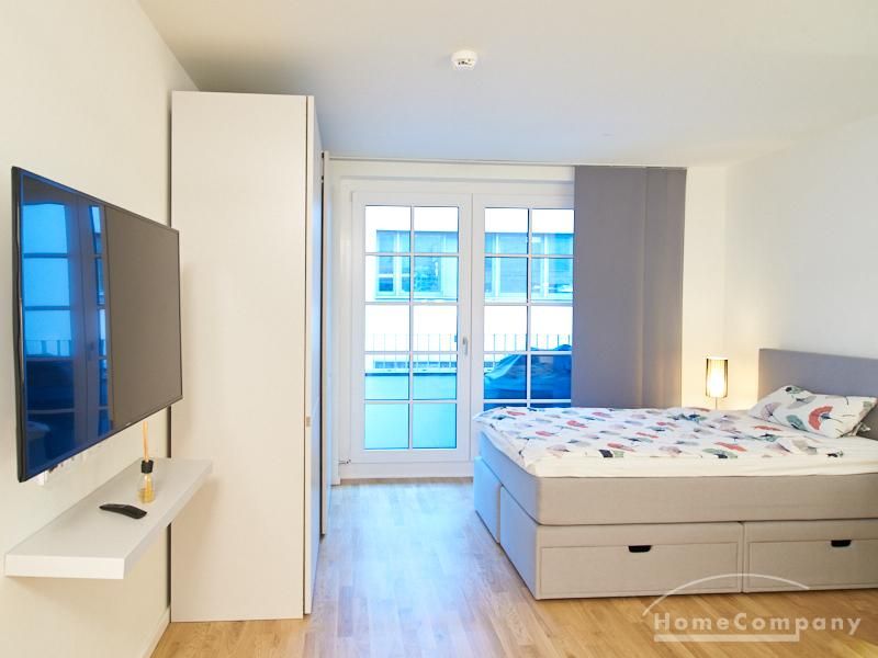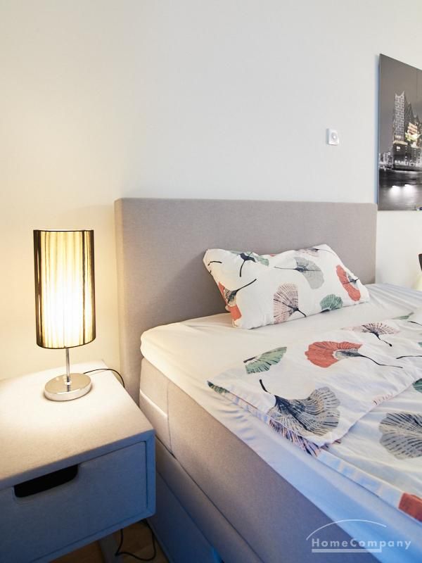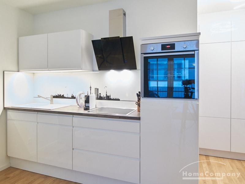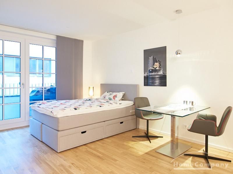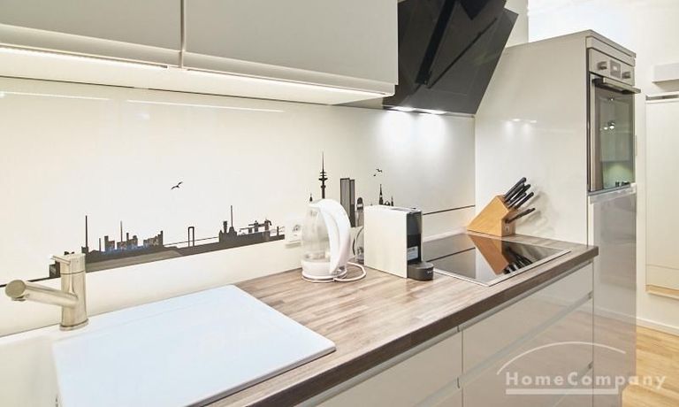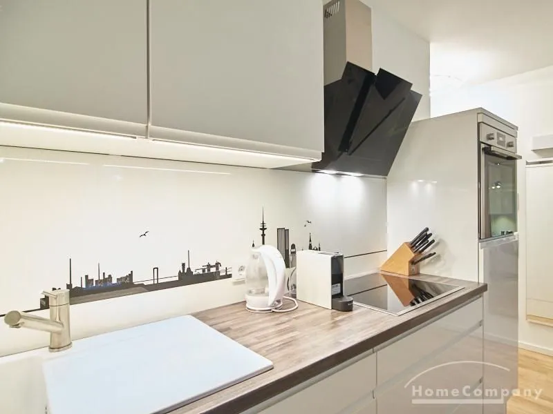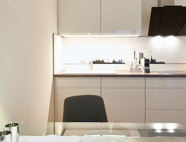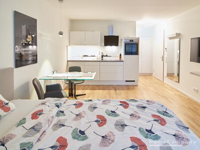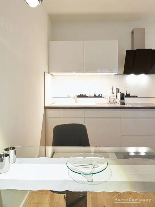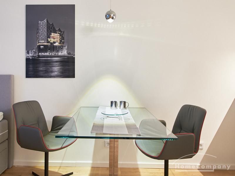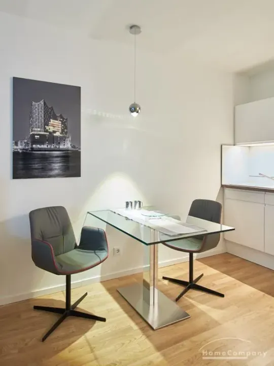 Das perfekt ausgestattete Apartment ist auf dem Gelände des historischen Firmensitzes in den Kühnehöfen gelegen. Innovative Technik bietet besonderen Wohnkomfort. So sind beispielsweise die Fenster mit einer dezenten Spiegeloberfläche versehen um perfekte Privatsphäre zu gewährleisten. Die offene Küche ist mit einem akustisch praktisch nicht wahrnehmbaren Kühlschrank ausgestattet. Angrenzend an die Küche befindet sich ein kleiner Essbereich mit einem modernen Glastisch. Das Apartment ist mit einem 1,40×2,10 m breiten Boxspringbett ausgestattet. Im großen Schiebetürenschrank steht reichlich Stauraum zur Verfügung. Ein besonderes Highlight ist die nur von der Hausgemeinschaft genutzte Dachterrasse. Hier kann man an langen Sommerabenden einen weiten Panoramablick über Hamburg genießen. Viele Hamburger Wahrzeichen, wie der Michel, die tanzenden Türme, die Elbphilharmonie und der Hafen liegen im Blickwinkel. Das Apartment verfügt über ein Wasch / Trockner Kombigerät.