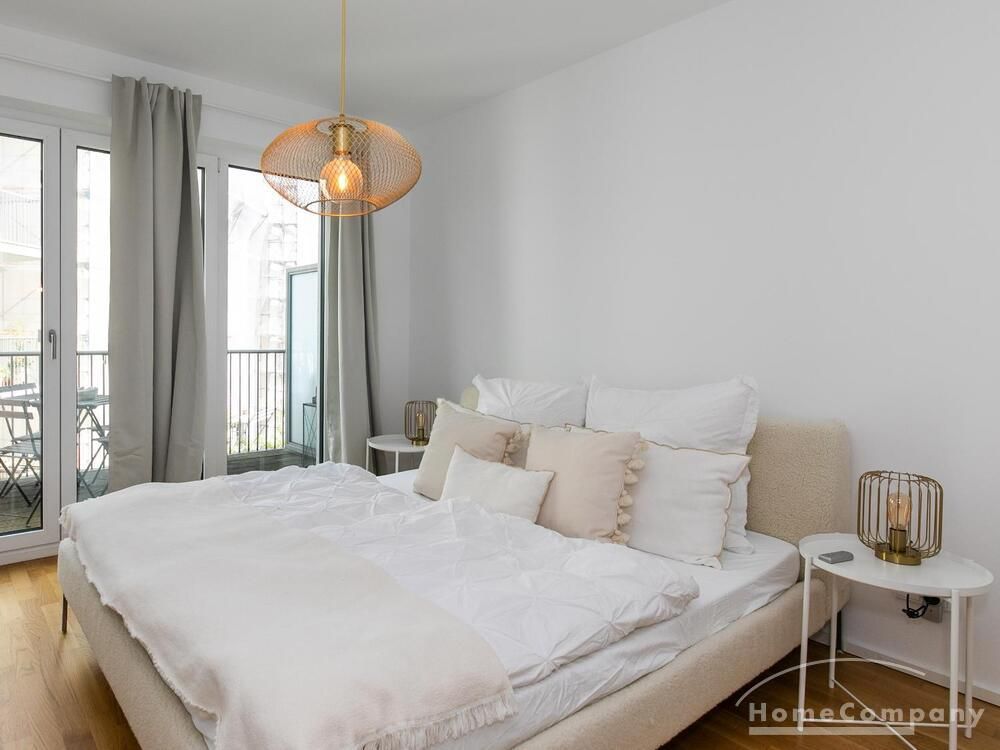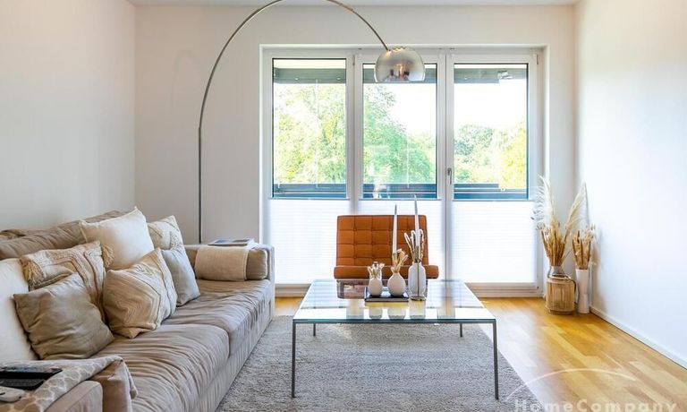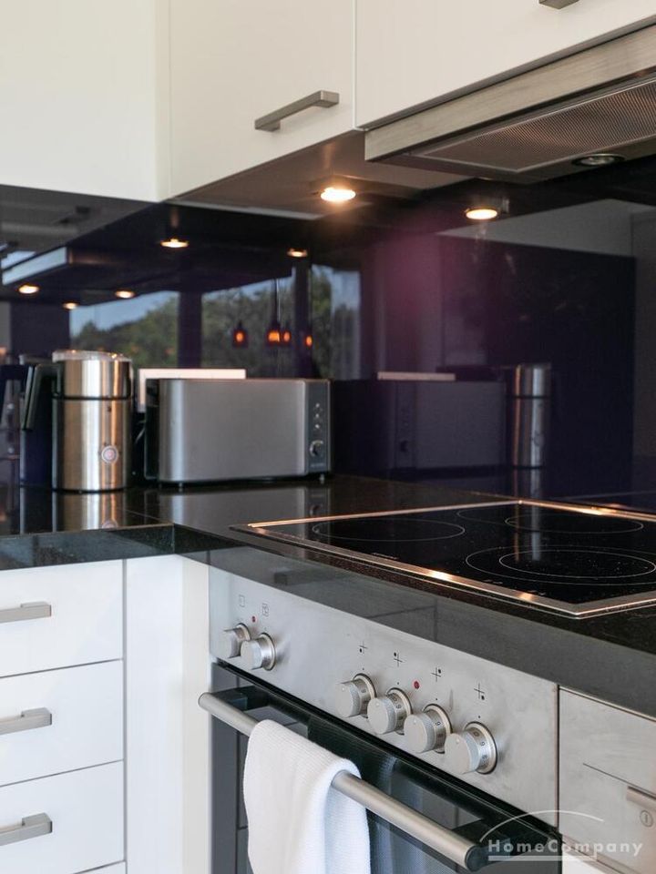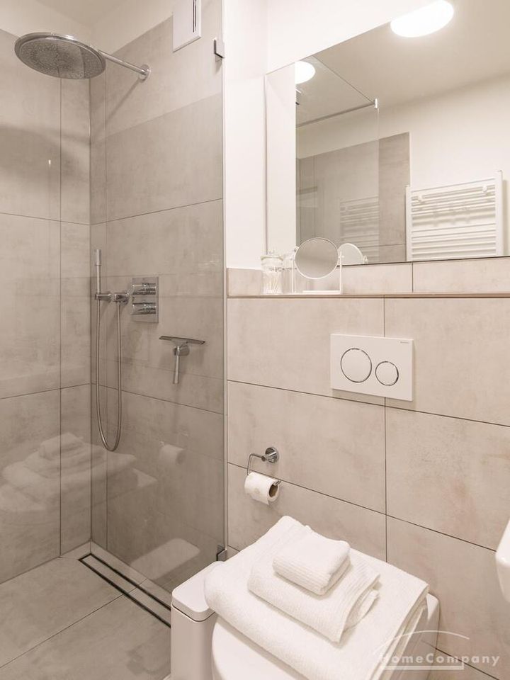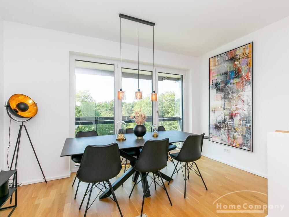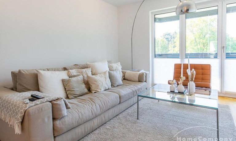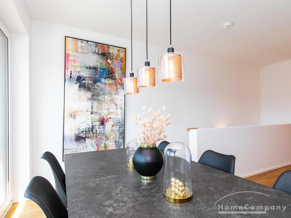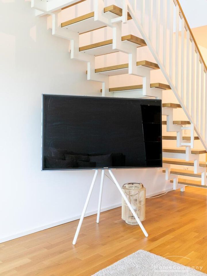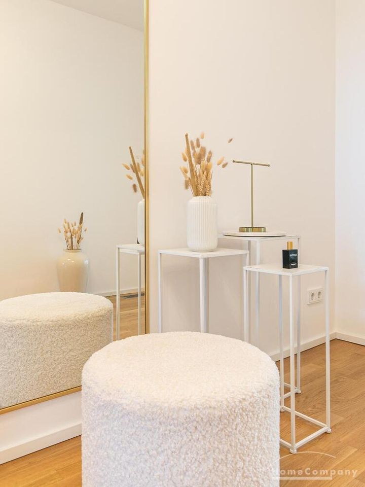 Die Einrichtung ist modern und in dezenten, harmonischen Farben gehalten. Die hochwertige Möblierung mit einigen Designerstücken vermittelt einen exklusiven wohnlichen Gesamteindruck. Die Wohnung ist mit Fußbodenheizung ausgestattet. Drei Balkone bieten reichlich Freifläche zum Entspannen nach Feierabend und am Wochenende. Die hochwertige technische Ausstattung rundet das Bild ab. Eine Bose Bluetooth Musikbox steht zur Verfügung. Der Flatscreen TV ist über Google Chromecast für verschiedene Dienste wie Netflix etc. mit den jeweiligen eigenen Accounts nutzbar. Einige Sender können auch ohne die eigenen Zugänge empfangen werden. Das Internet ist über Glasfaser mit 1000 MBit eingerichtet. Weiterhin steht ein Miele Trockner zur Verfügung.