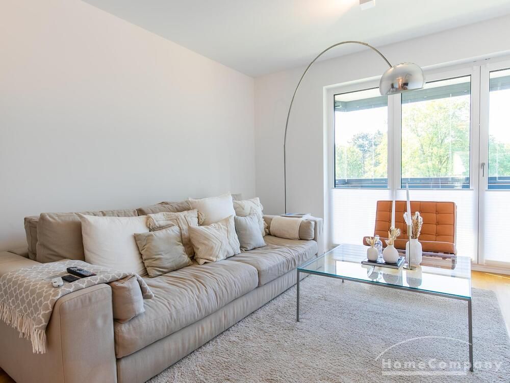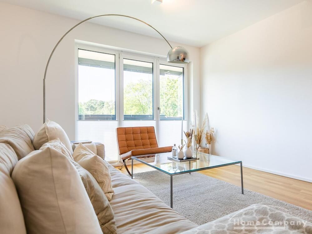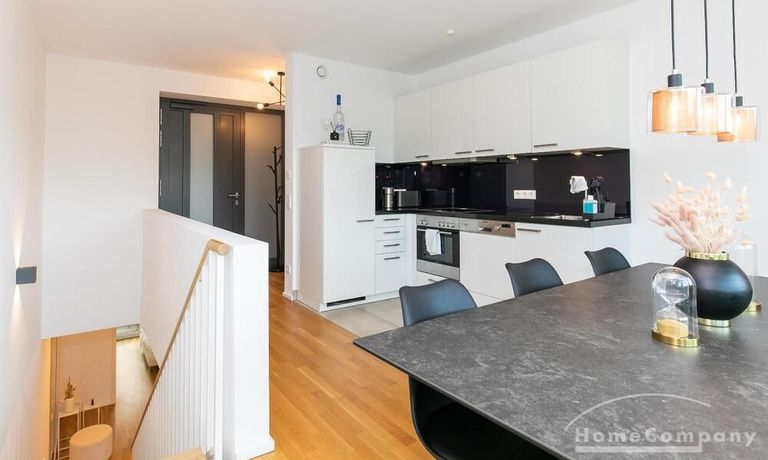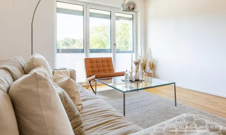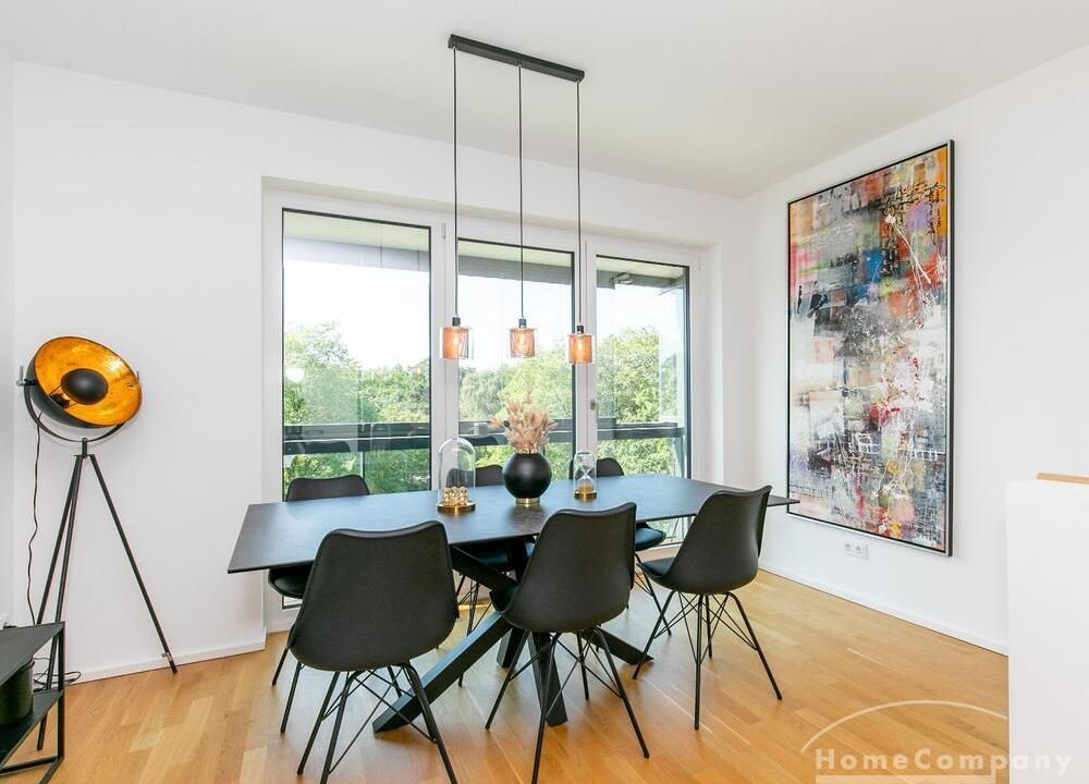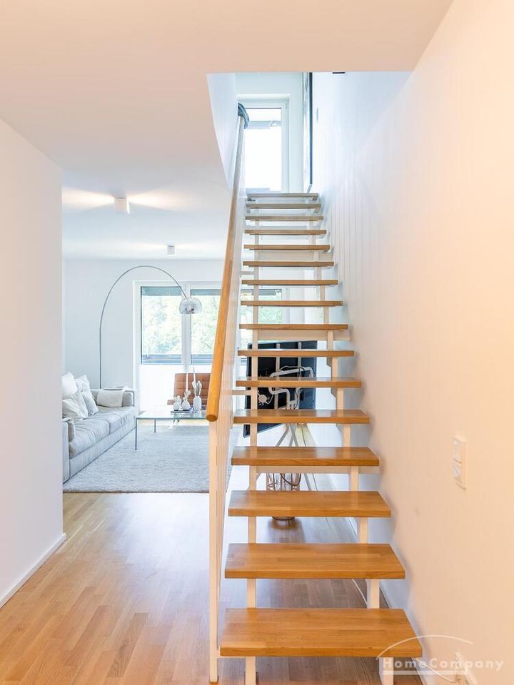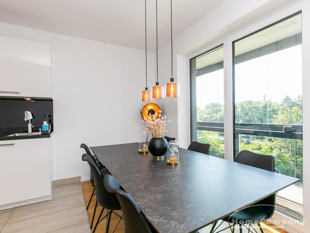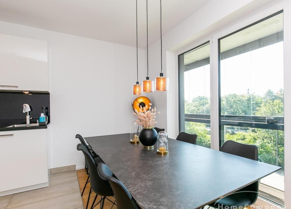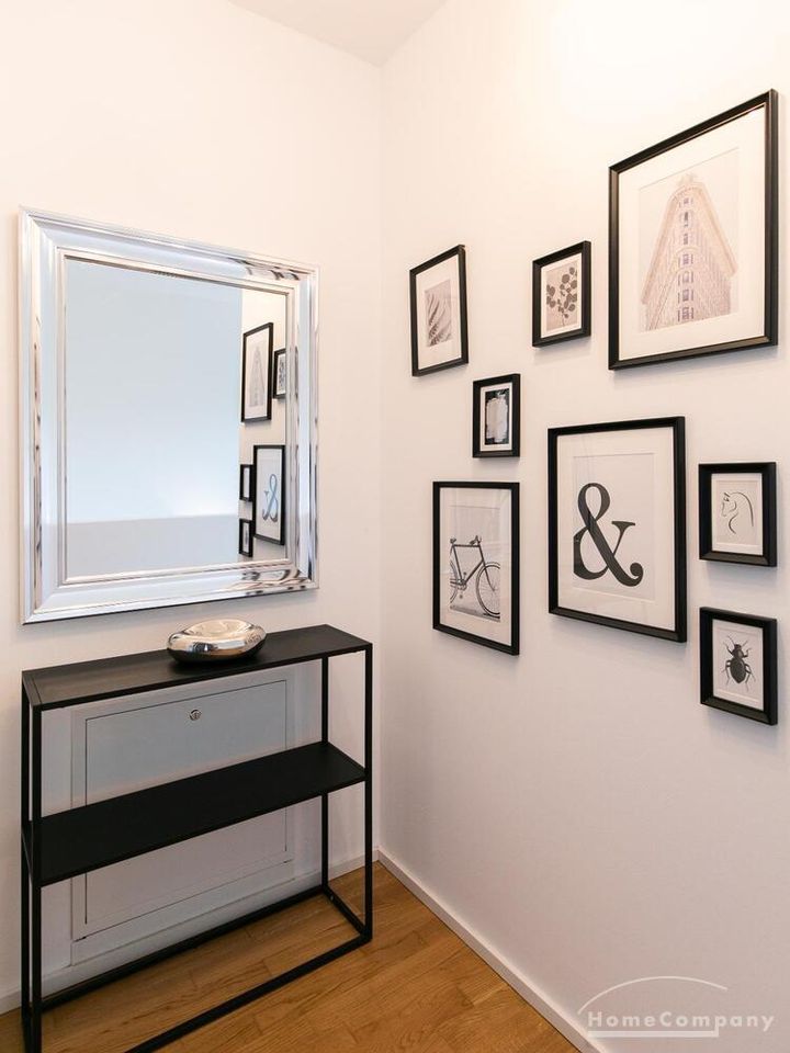 Die Einrichtung ist modern und in dezenten, harmonischen Farben gehalten. Die hochwertige Möblierung mit einigen Designerstücken vermittelt einen exklusiven wohnlichen Gesamteindruck. Die Wohnung ist mit Fußbodenheizung ausgestattet. Drei Balkone bieten reichlich Freifläche zum Entspannen nach Feierabend und am Wochenende. Die hochwertige technische Ausstattung rundet das Bild ab. Eine Bose Bluetooth Musikbox steht zur Verfügung. Der Flatscreen TV ist über Google Chromecast für verschiedene Dienste wie Netflix etc. mit den jeweiligen eigenen Accounts nutzbar. Einige Sender können auch ohne die eigenen Zugänge empfangen werden. Das Internet ist über Glasfaser mit 1000 MBit eingerichtet. Weiterhin steht ein Miele Trockner zur Verfügung.