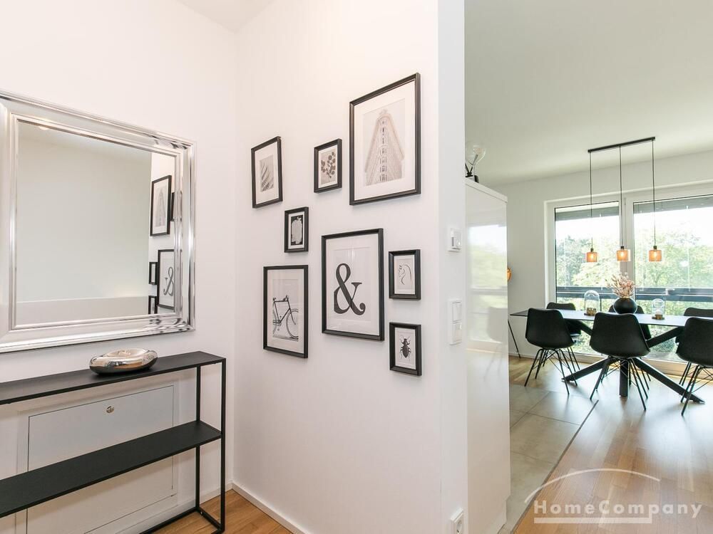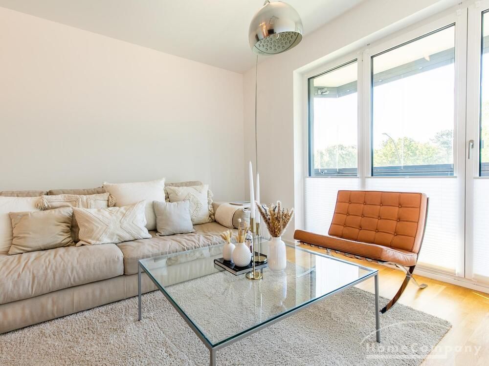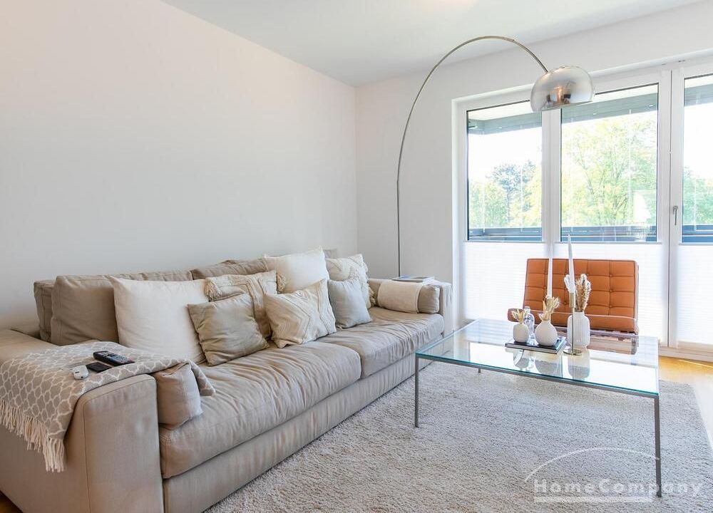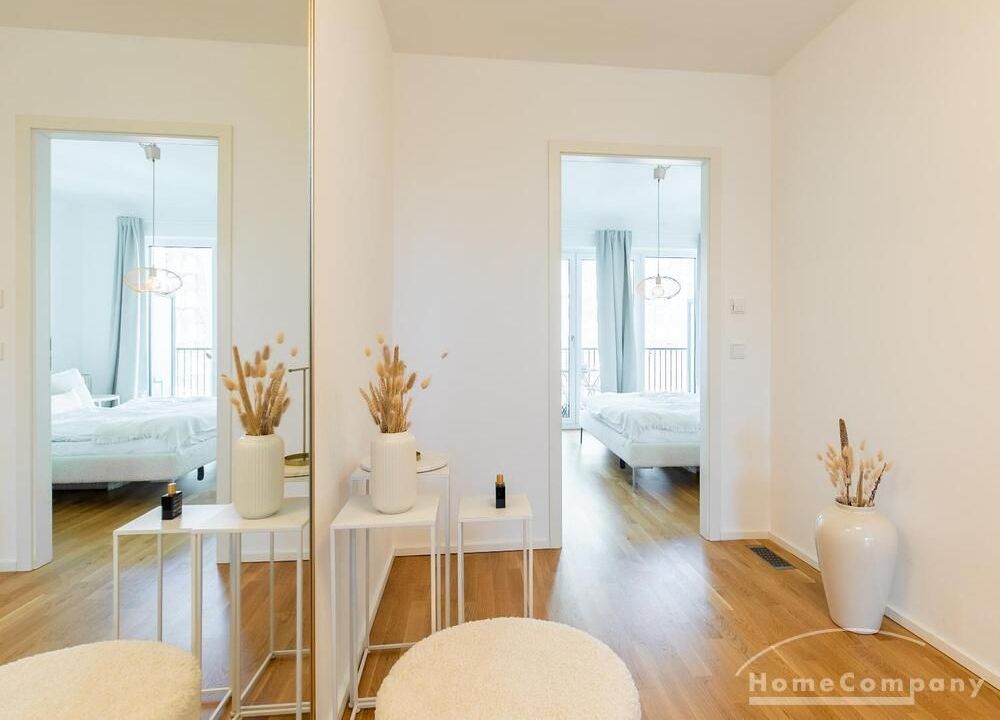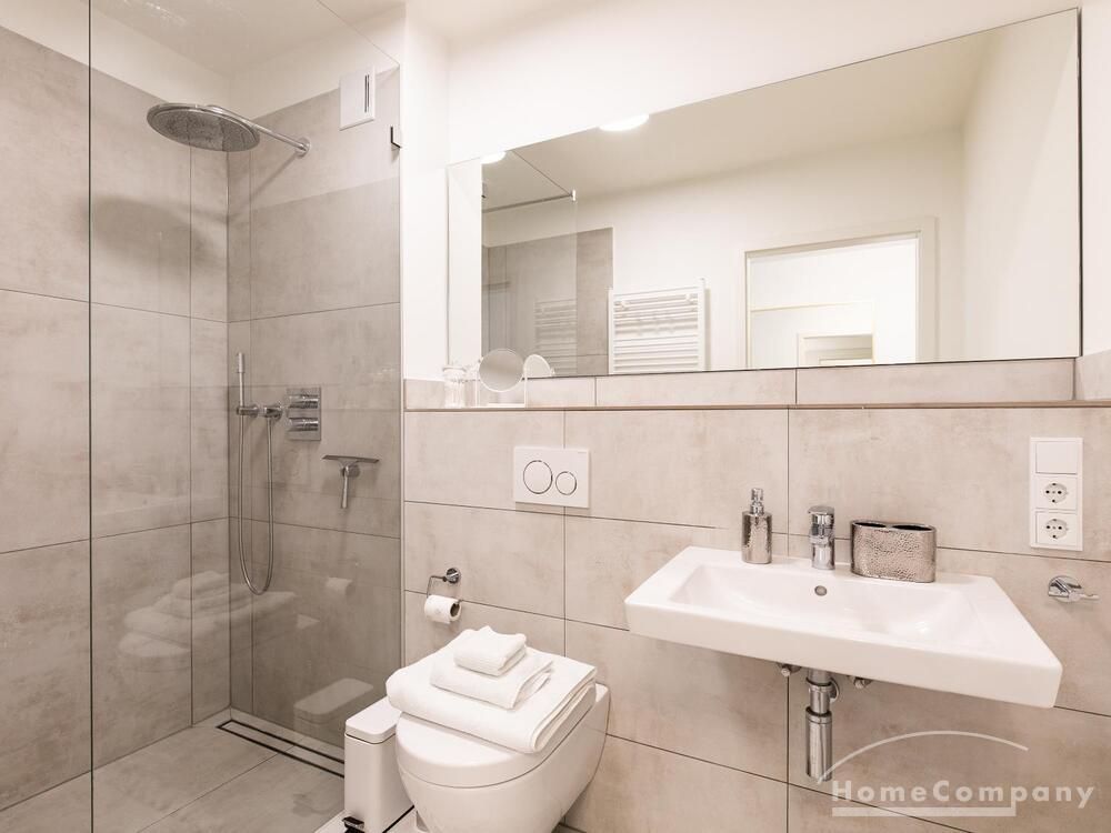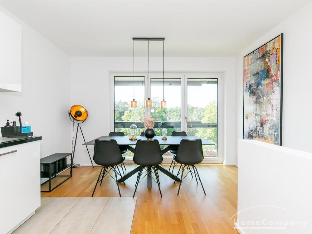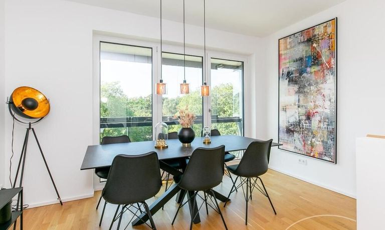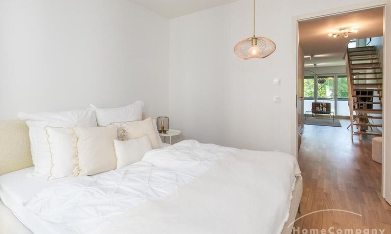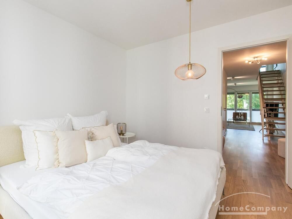 Die Einrichtung ist modern und in dezenten, harmonischen Farben gehalten. Die hochwertige Möblierung mit einigen Designerstücken vermittelt einen exklusiven wohnlichen Gesamteindruck. Die Wohnung ist mit Fußbodenheizung ausgestattet. Drei Balkone bieten reichlich Freifläche zum Entspannen nach Feierabend und am Wochenende. Die hochwertige technische Ausstattung rundet das Bild ab. Eine Bose Bluetooth Musikbox steht zur Verfügung. Der Flatscreen TV ist über Google Chromecast für verschiedene Dienste wie Netflix etc. mit den jeweiligen eigenen Accounts nutzbar. Einige Sender können auch ohne die eigenen Zugänge empfangen werden. Das Internet ist über Glasfaser mit 1000 MBit eingerichtet. Weiterhin steht ein Miele Trockner zur Verfügung.