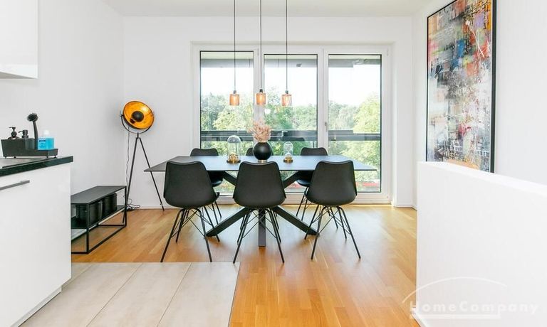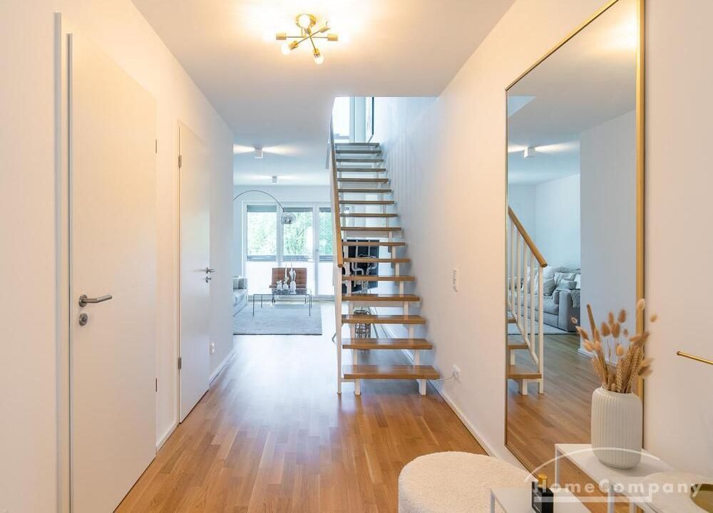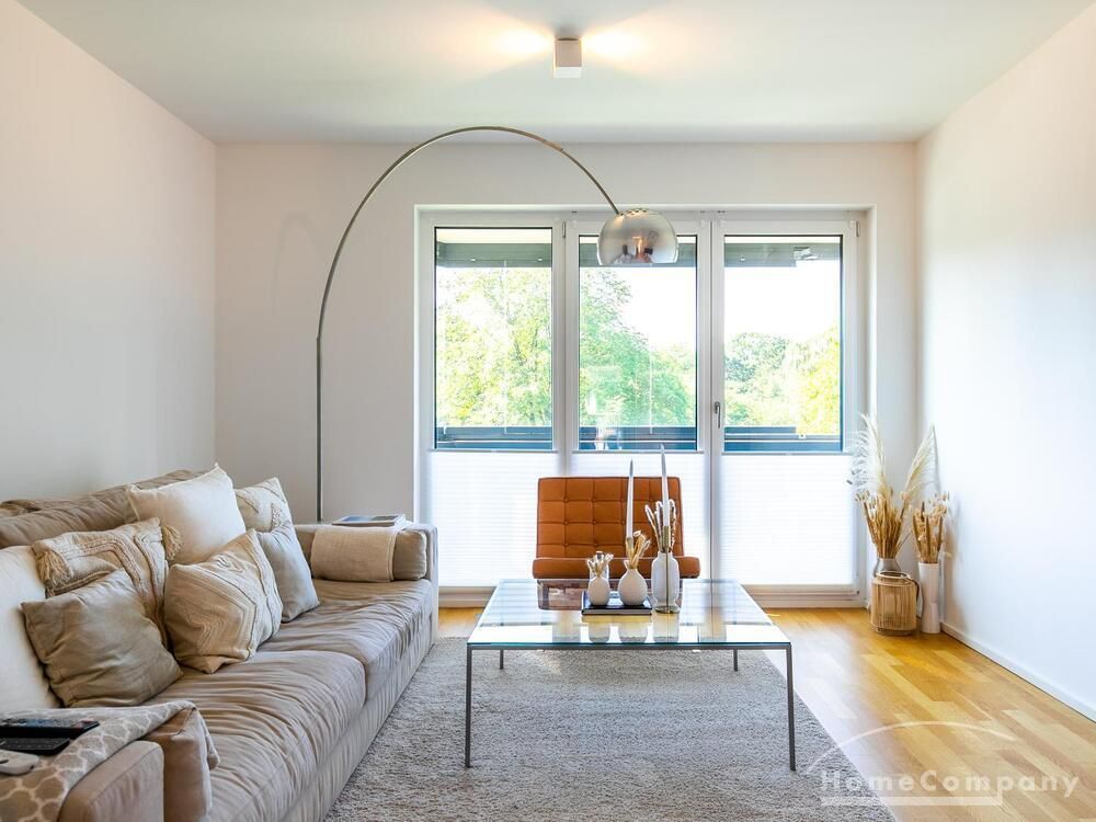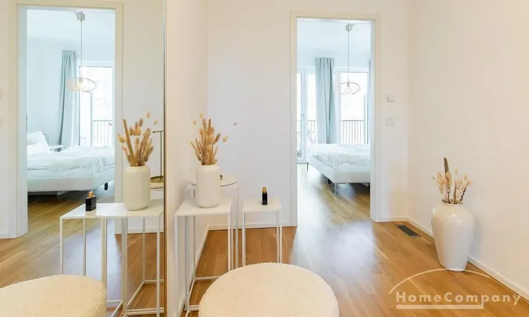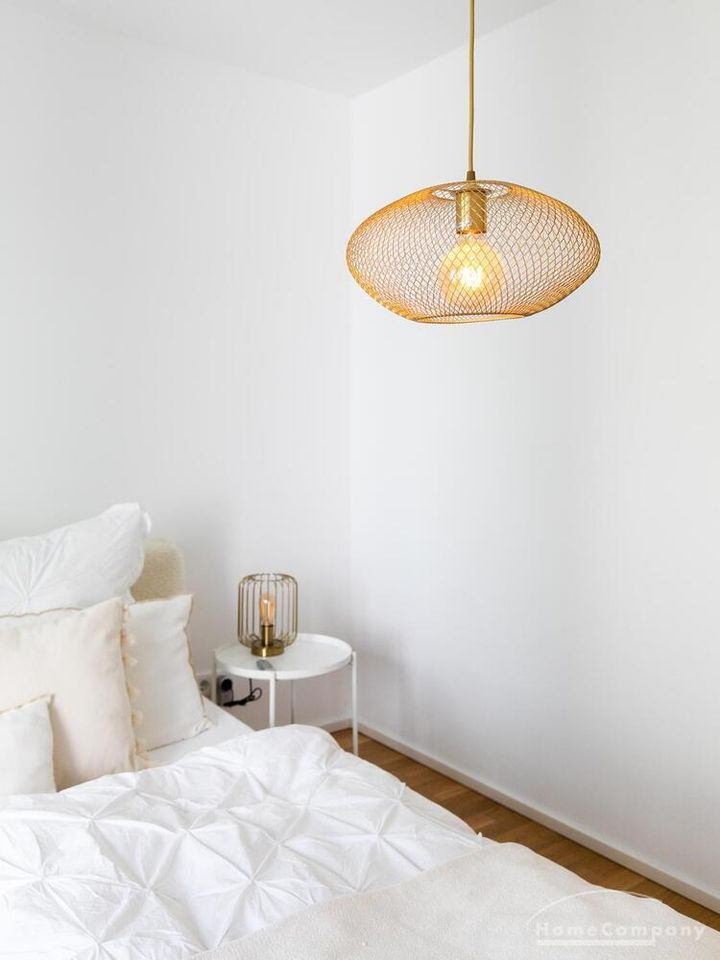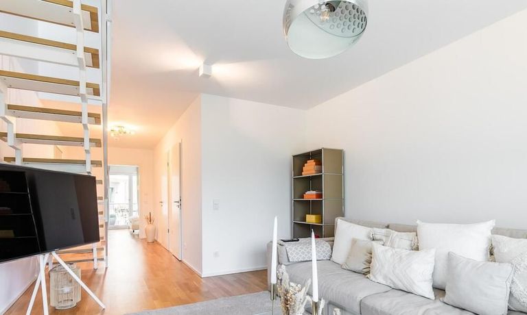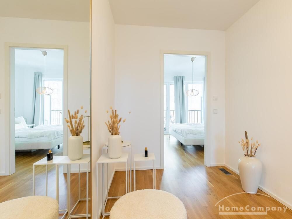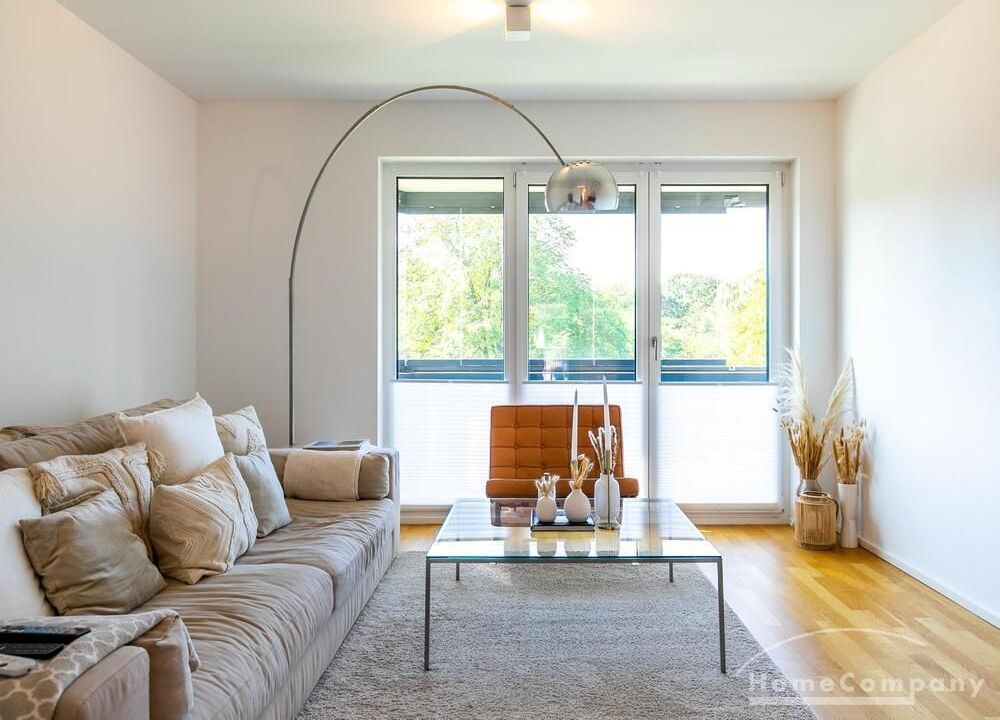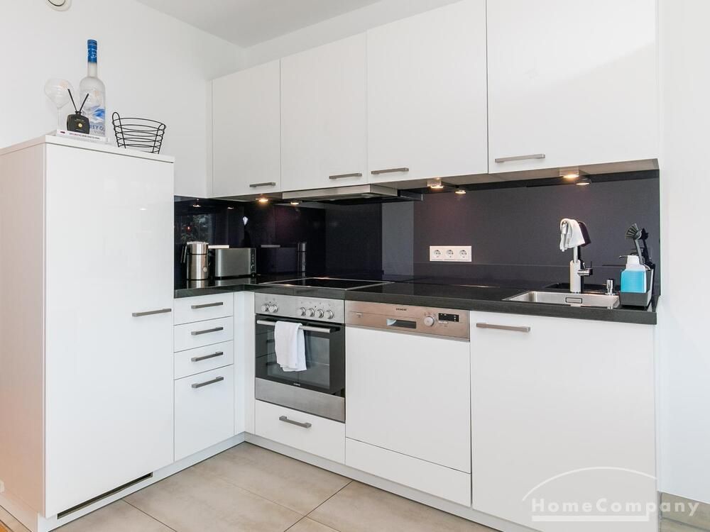Die Einrichtung ist modern und in dezenten, harmonischen Farben gehalten. Die hochwertige Möblierung mit einigen Designerstücken vermittelt einen exklusiven wohnlichen Gesamteindruck. Die Wohnung ist mit Fußbodenheizung ausgestattet. Drei Balkone bieten reichlich Freifläche zum Entspannen nach Feierabend und am Wochenende. Die hochwertige technische Ausstattung rundet das Bild ab. Eine Bose Bluetooth Musikbox steht zur Verfügung. Der Flatscreen TV ist über Google Chromecast für verschiedene Dienste wie Netflix etc. mit den jeweiligen eigenen Accounts nutzbar. Einige Sender können auch ohne die eigenen Zugänge empfangen werden. Das Internet ist über Glasfaser mit 1000 MBit eingerichtet. Weiterhin steht ein Miele Trockner zur Verfügung.