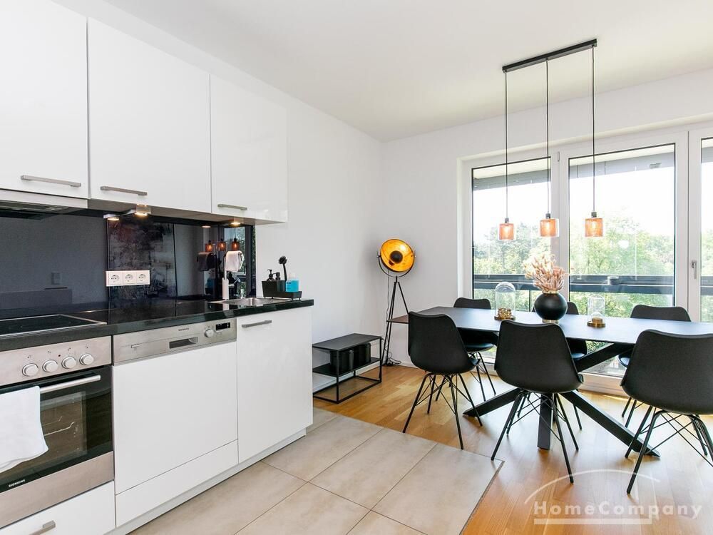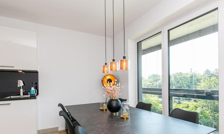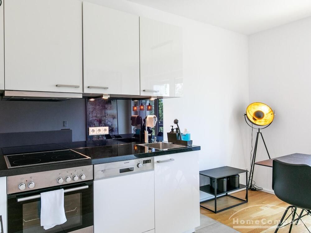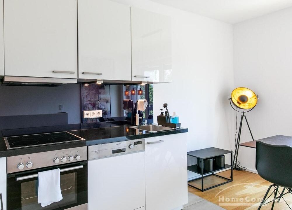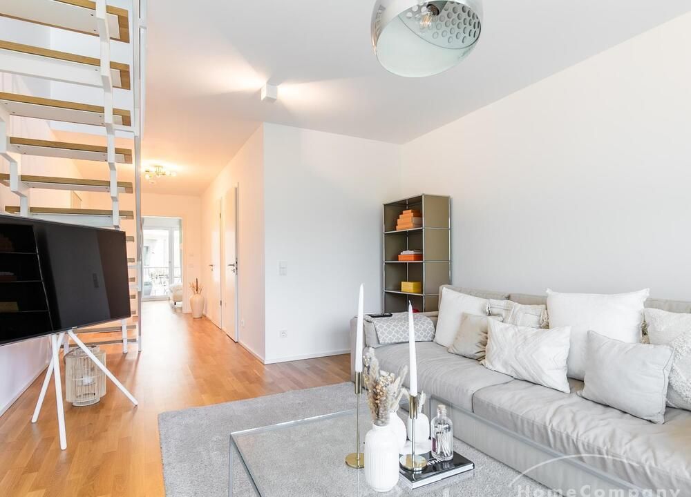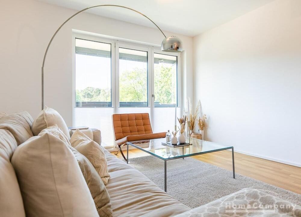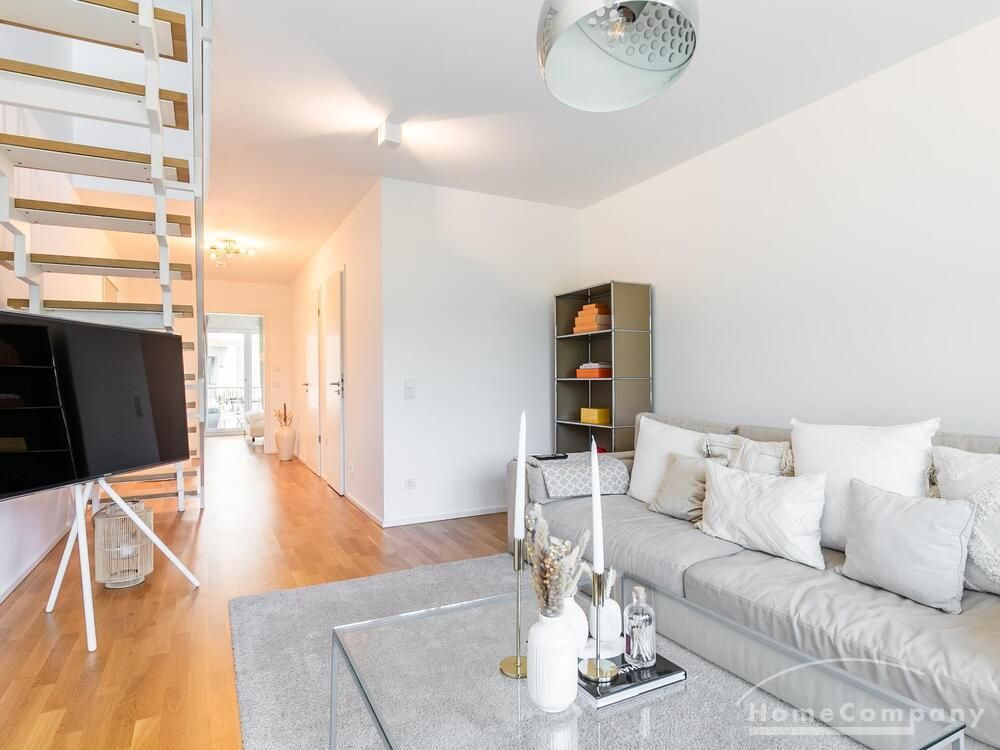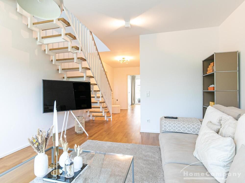 Die Einrichtung ist modern und in dezenten, harmonischen Farben gehalten. Die hochwertige Möblierung mit einigen Designerstücken vermittelt einen exklusiven wohnlichen Gesamteindruck. Die Wohnung ist mit Fußbodenheizung ausgestattet. Drei Balkone bieten reichlich Freifläche zum Entspannen nach Feierabend und am Wochenende. Die hochwertige technische Ausstattung rundet das Bild ab. Eine Bose Bluetooth Musikbox steht zur Verfügung. Der Flatscreen TV ist über Google Chromecast für verschiedene Dienste wie Netflix etc. mit den jeweiligen eigenen Accounts nutzbar. Einige Sender können auch ohne die eigenen Zugänge empfangen werden. Das Internet ist über Glasfaser mit 1000 MBit eingerichtet. Weiterhin steht ein Miele Trockner zur Verfügung.