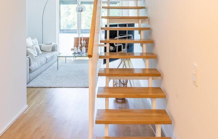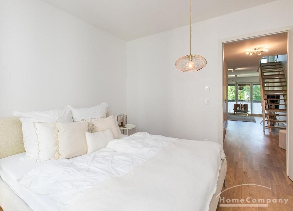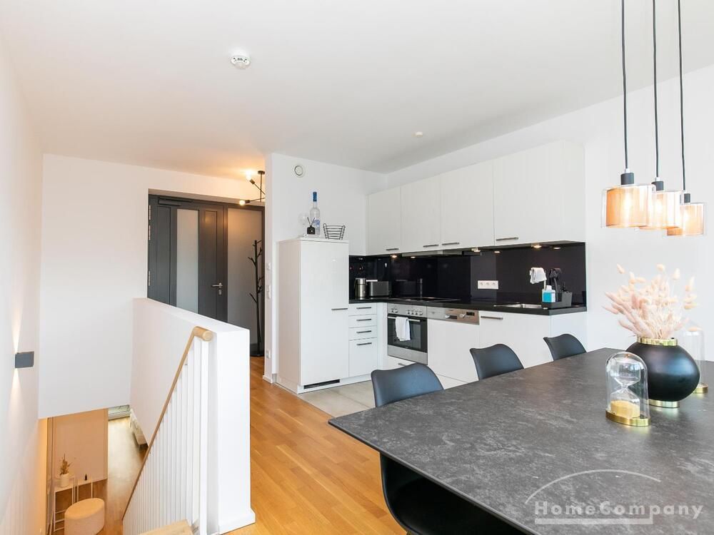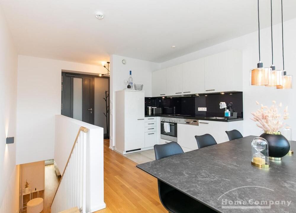 Die moderne Maisonette Wohnung befindet sich im zentral gelegenen Rotherbaum / Grindel Viertel. Auf der oberen Ebene befindet sich der großzügige Wohn- und Essbereich mit einer offenen Küche. Große bodentiefe Fensterfronten sorgen für viel Tageslicht in der Wohnung und einen weiten Blick über Hamburg, Abends blickt man auf den beleuchteten Fernsehturm. Über eine offene Treppe gelangt man in die untere Ebene der Wohnung. Das Schlafzimmer ist mit einem 1,80m breiten Doppelbett ausgestattet.