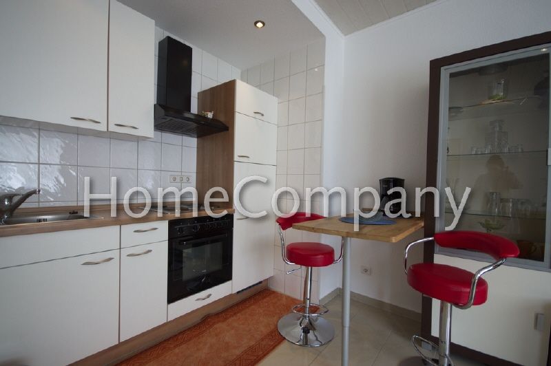 Ansprechende, neue moderne Möblierung, Fliesenboden. Die Küche mit Einbauküche und Essbar ist im Wohnraum intergiert. Der Wohnbereich ist mit ausziehbarer Couch und SAT-TV ausgestattet, Zugang zum Balkon. Doppelschlafzimmer mit dreitürigem Kleiderschrank. Zusätzliches Gäste- bzw. Kinderzimmer mit Einzelbett. Innenliegendes weiß gefliestes Duschbad mit Lüftung. Diele mit Garderobenmöbeln.