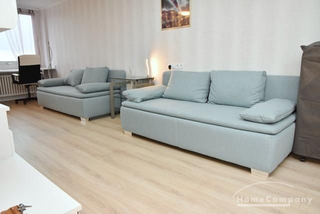 Wohn/Schlafzimmer mit 2 Schlafsofas 140×200 cm, Couchtisch, Wohnwand mit Smart-TV, Internet (500MBit) inklusive, Schreibtisch mit Stuhl, Kleiderschrank, Regal,