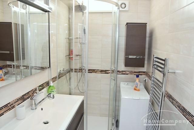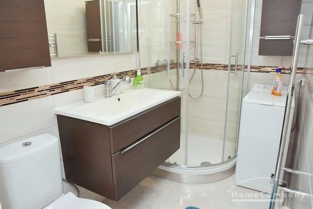 Modernes und helles Duschbad/WC mit Waschmaschine.