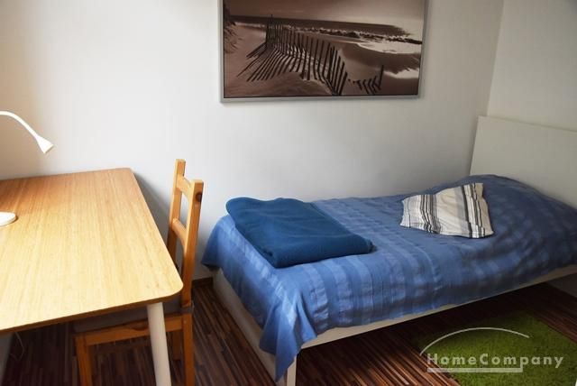Arbeits/Schlafzimmer mit Einzelbett 100×200 cm und Tisch/Schreibtisch, Kleiderschrank, Laminat.