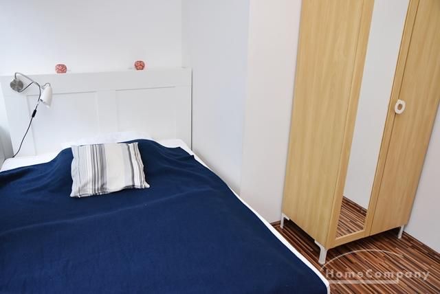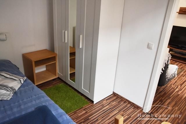 Schlafzimmer mit Bett 140 cm, Kleiderschrank, Laminatfußboden.