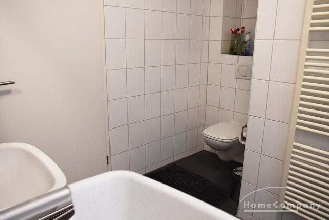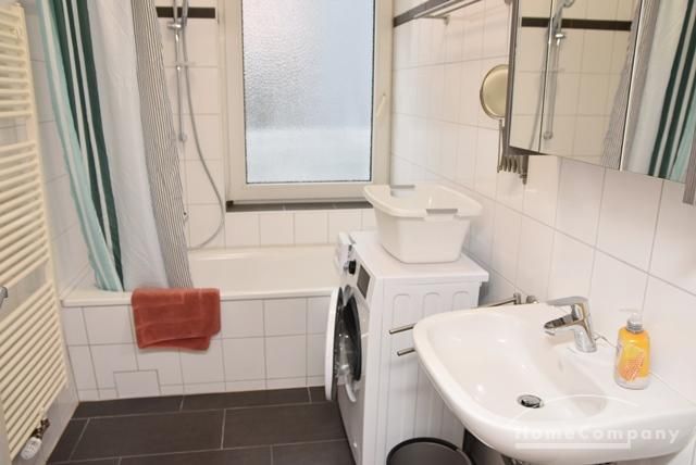 Wannenbad/WC, Fliesenboden, Waschmaschine.
