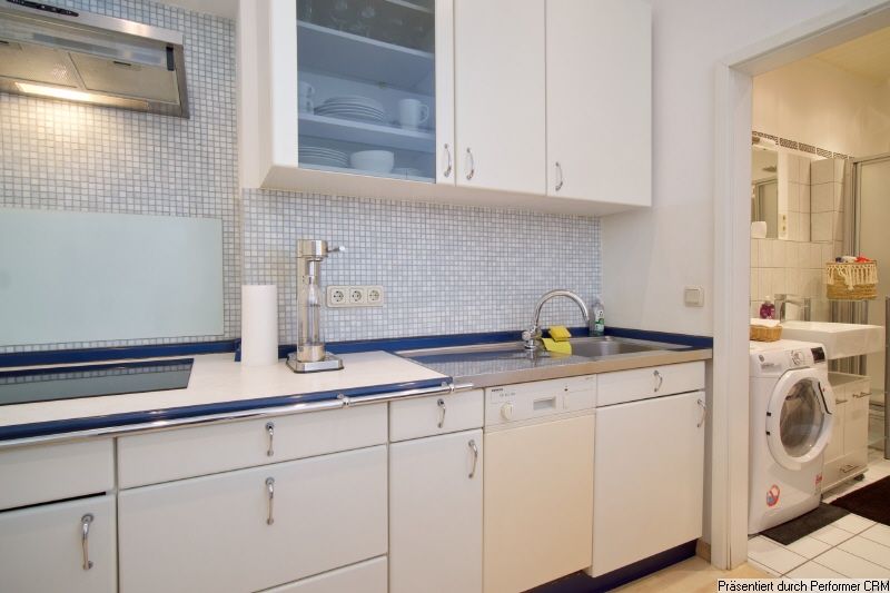 Die kleine aber feine offene Einbauküche mit Spülmaschine, Ceranherd und Microwelle ist mit Koch- und Essgeschirr ausgestattet, es gibt eine Kühl-Gefrier-Kombination. Komplettes Inventar inklusive Bettwäsche und Handtücher. Ein PKW-Stellplatz kann angemietet werden.