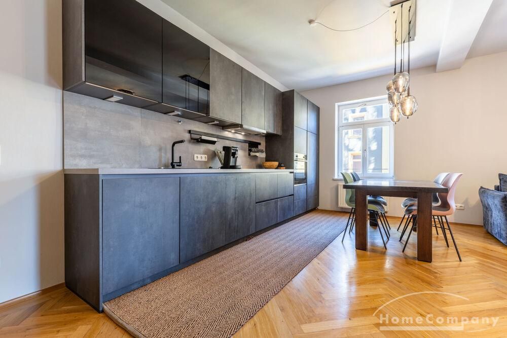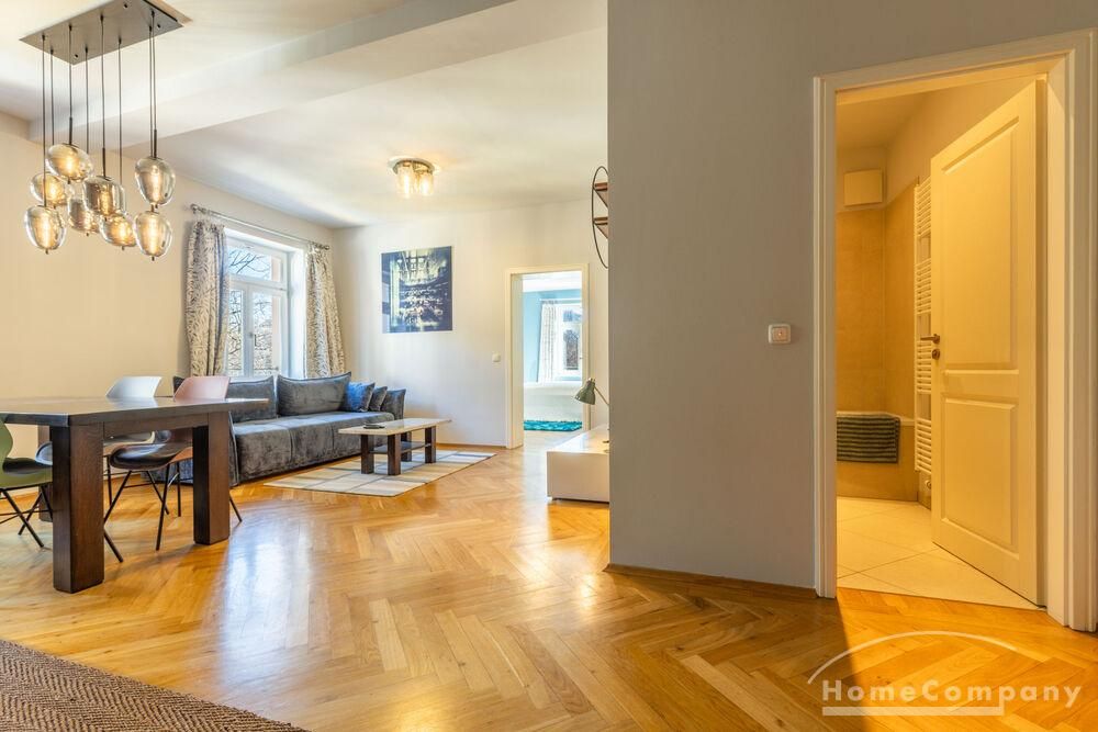Ein hochwertiger Parkettboden sorgt in der gesamten Wohnung für eine warme und stilvolle Atmosphäre. Internet ist bereits in der Miete enthalten.