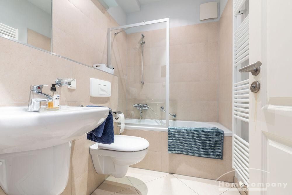Das Badezimmer ist modern gestaltet und bietet eine Badewanne mit eleganter Glasduschabtrennung. Das helle Schlafzimmer besticht durch ein komfortables Doppelbett und einen geräumigen Kleiderschrank.