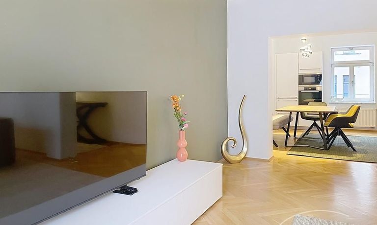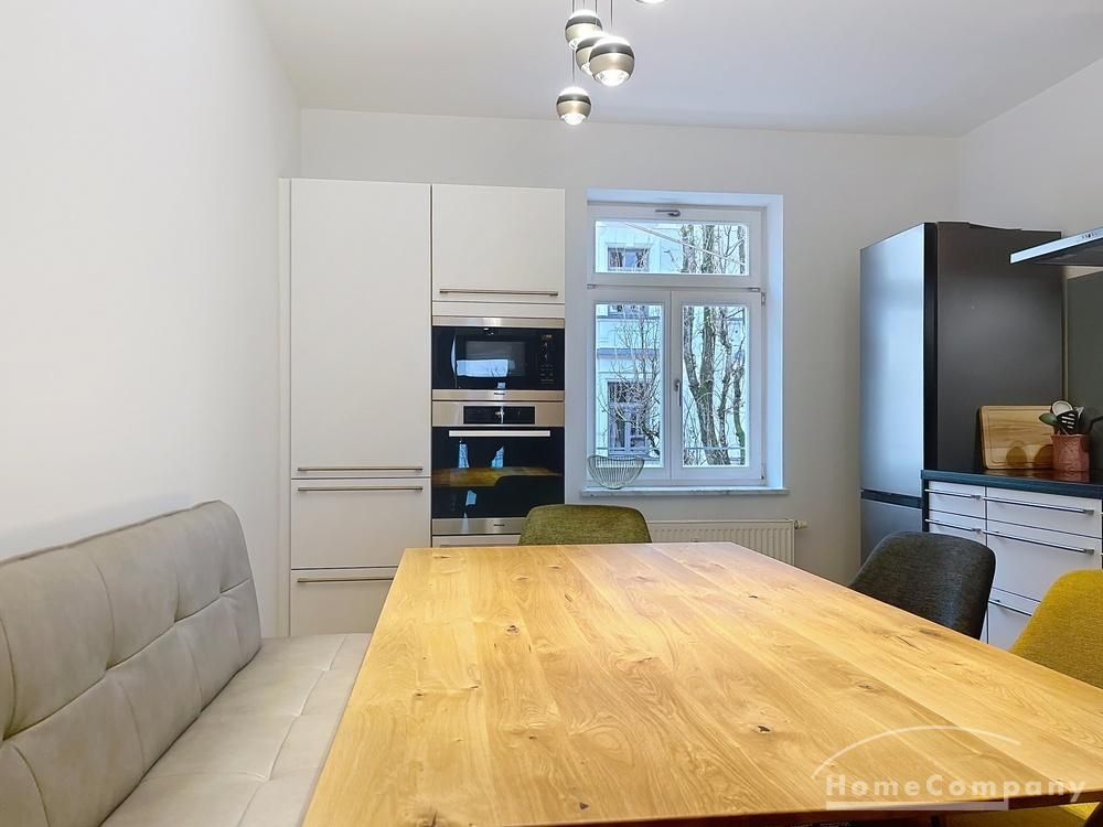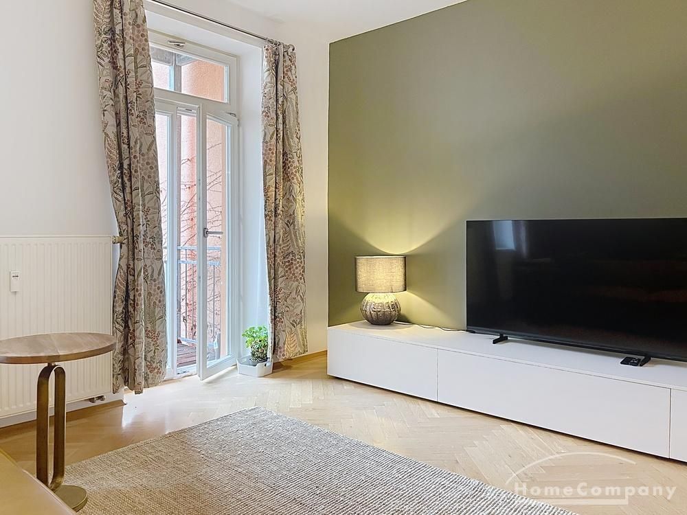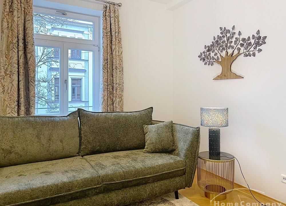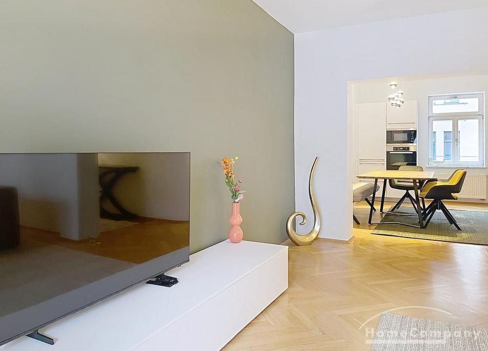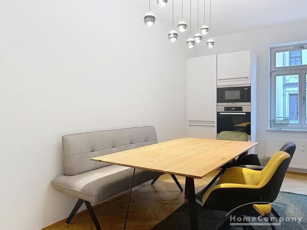 Der großzügige Wohn- und Essbereich bildet das Herzstück der Wohnung. Die moderne, voll ausgestattete Küche mit großem Essbereich ist offen zum Wohnzimmer gestaltet und schafft eine elegante, kommunikative Wohnatmosphäre. Das Wohnzimmer ist mit einer hochwertigen Ledercouch sowie TV ausgestattet und bietet direkten Zugang zum großen Balkon, der ruhig zum Hinterhof ausgerichtet ist.