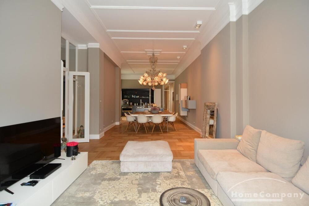 Diese hoch exklusive Maisonette-Altbauwohnung im 4. Obergeschoss mit Aufzug erstreckt sich weitläufig auf zwei Etagen. Die sanierte  Altbauwohnung besticht mit wunderschönen Stuckverzierungen, Flügeltüren und hochwertigen Parkettfußboden. Luxuriöse Möblierung, großzügiger Wohnraum mit Westloggia und ausdehnenden Ess-/Küchenbereich, maßgefertigte Boffi-Einbauküche. Vier große, gemütliche Schlafzimmer, eines mit Ankleide und tagesbelichtetem Badezimmer ensuite. Separates Gästeduschbad mit Regendusche und Fußbodenheizung, zwei weitere Gäste-WCs, drei Balkone, eine Westloggia und eine großzügige Dachterrasse.