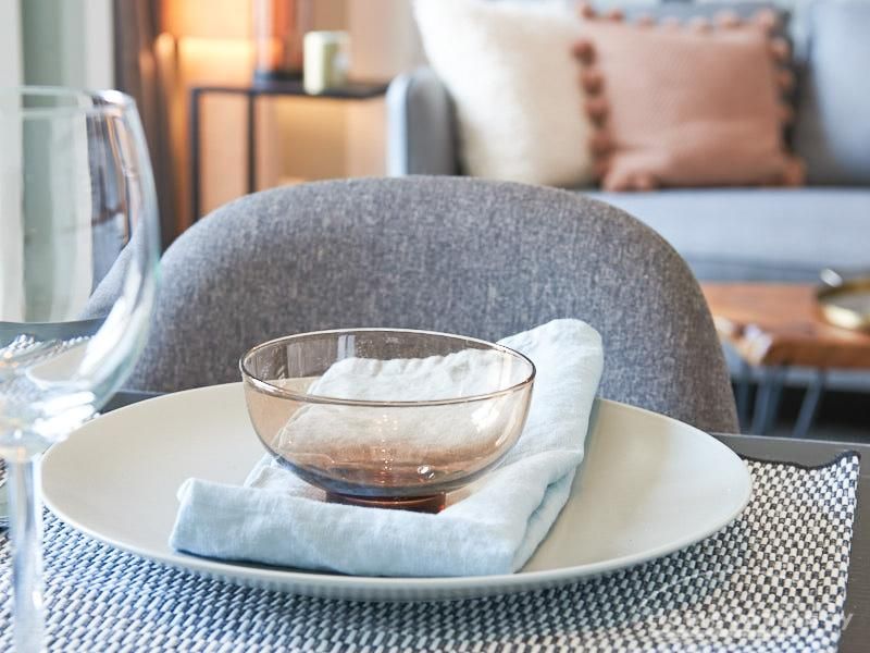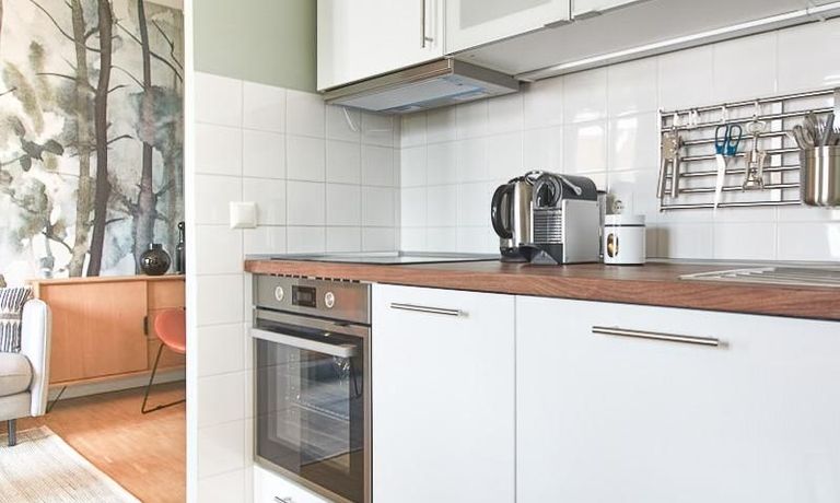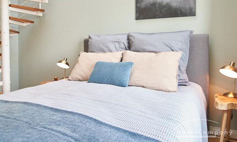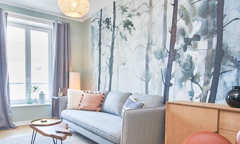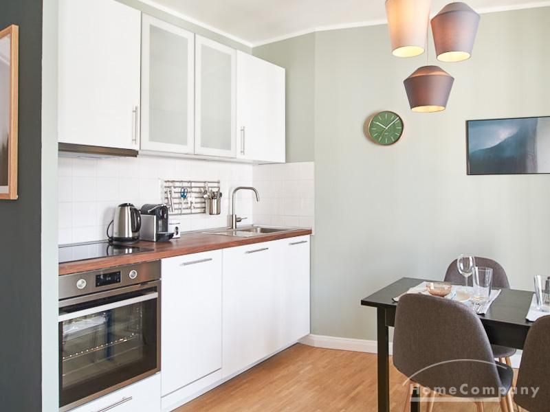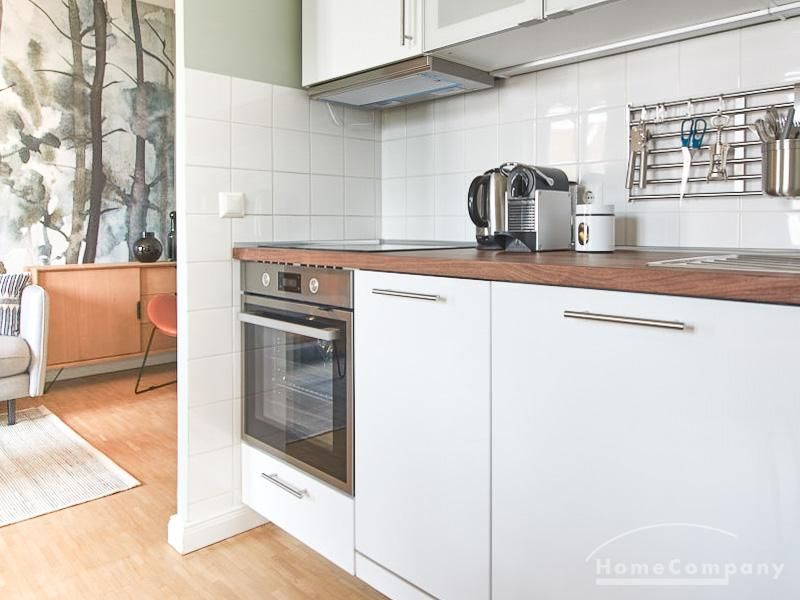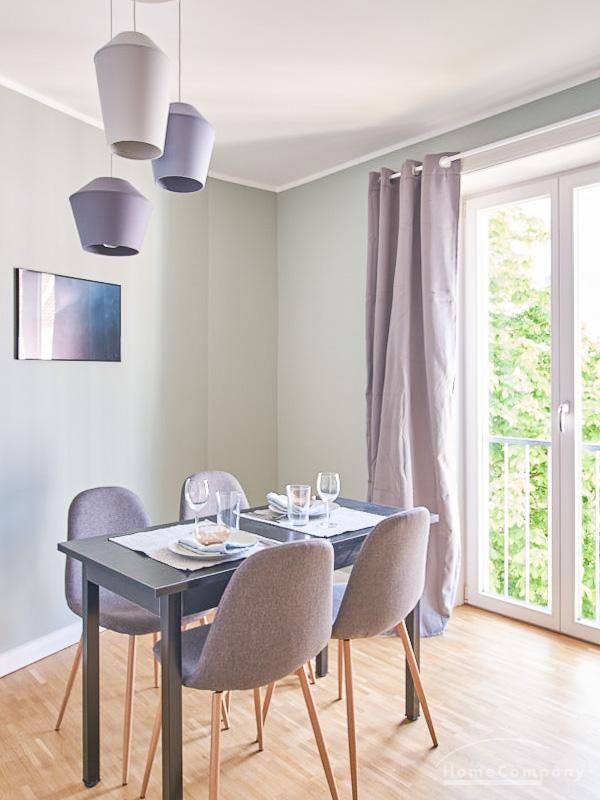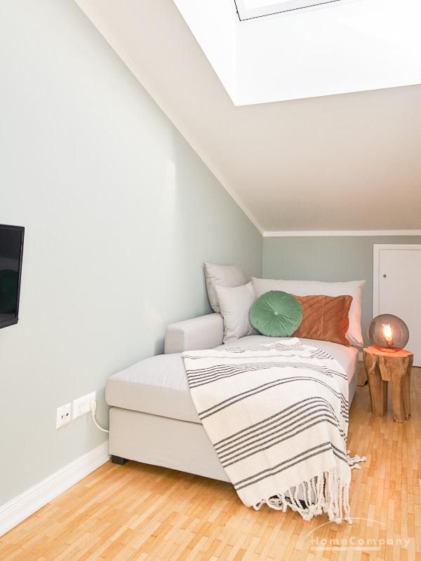 durch eine ruhige, gemütliche und doch elegante Atmosphäre. Diese wird durch einen zurückhaltenden, hellen Grüngrauton geschaffen, der sich durch alle Räume zieht. Besondere Hingucker bilden hier die Tapete im Aquarell-Look im Wohnbereich und die gegenüber liegende Wand in einem tiefen Dunkelgrün. Unterstrichen wird das sanfte Gesamtbild durch Akzente in Vollholz, Leder und Messing. Eine offene Küche zum Wohnbereich und ein Schlafzimmer (Doppelbett 1,60 m) mit Aufgang zu einem zweiten Wohnbereich tragen zum hellen und natürlichen Wohngefühl bei. TV über Digitalreceiver. Sehr zentrale Lage zwischen Uni und Messegelände.