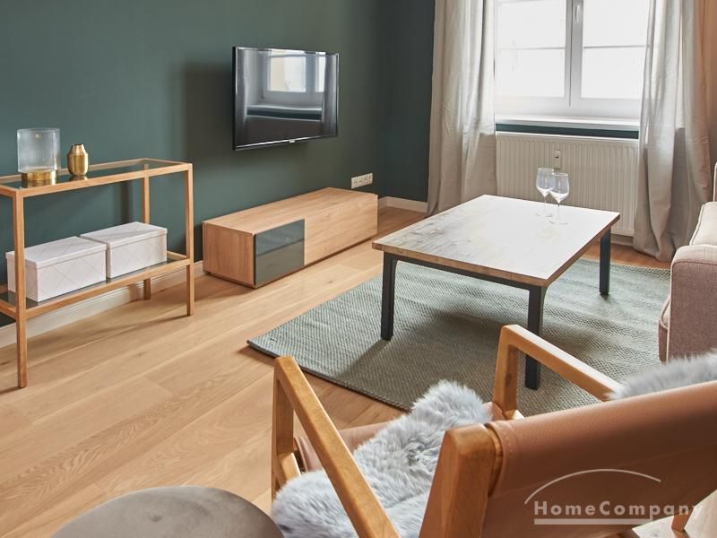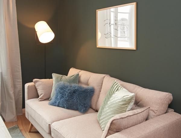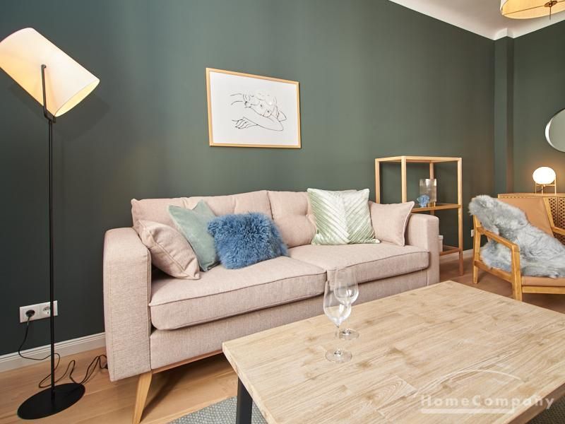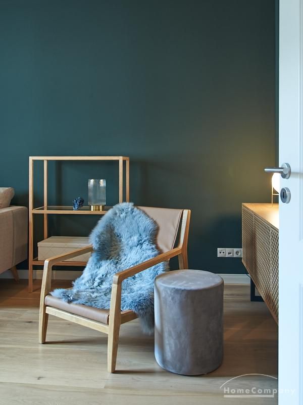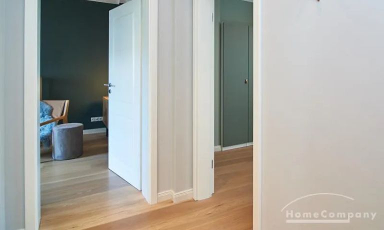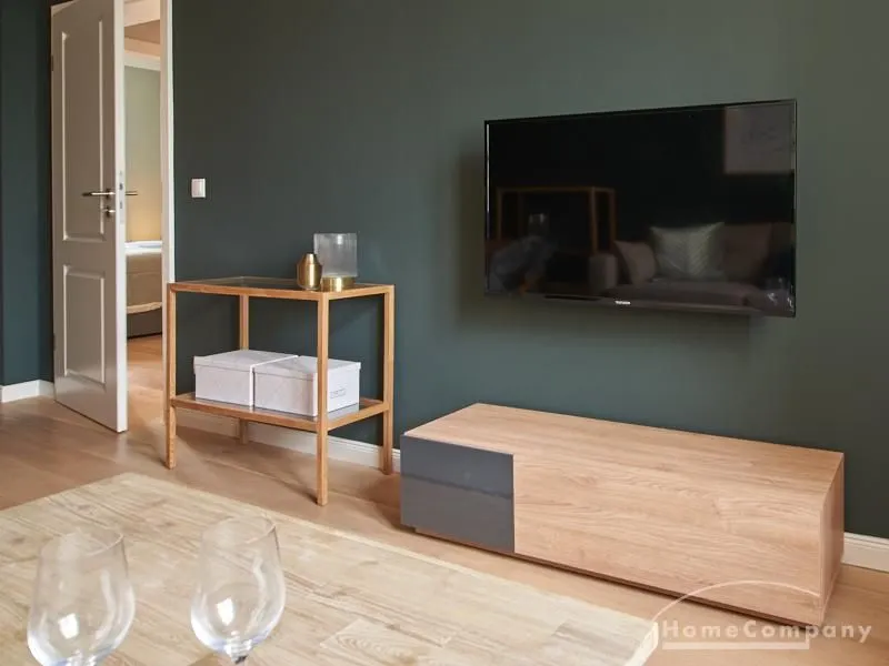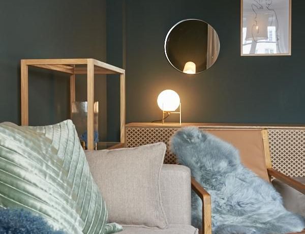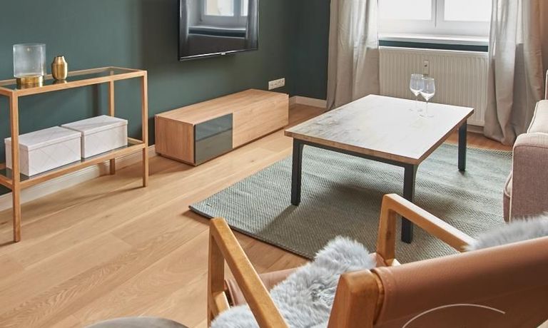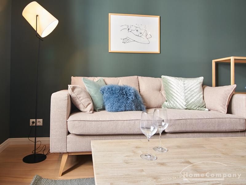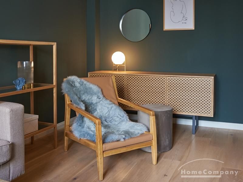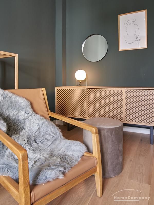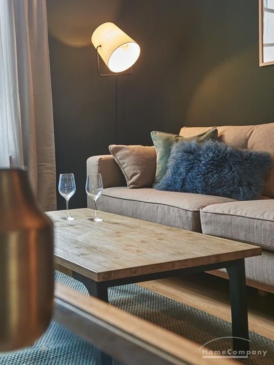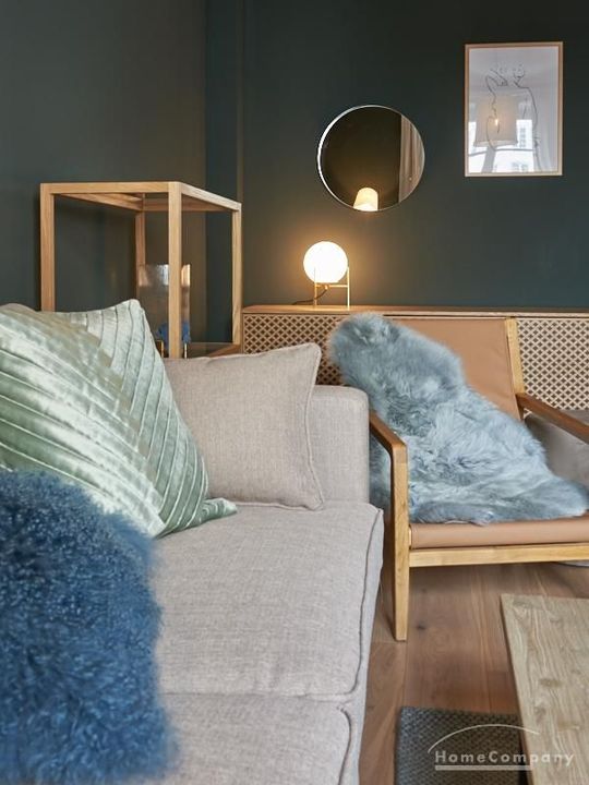 Tief dunkelgrüne Wände im Wohnbereich und rauchig grüne und graue Farben im übrigen Teil der Wohnung kennzeichnen einen unverwechselbaren, modernen Einrichtungsstil. Elegante Möbelstücke, sorgfältig ausgesuchte Accessoires und Elemente in Eichenholz setzen warme und interessante Akzente. Gemütlichkeit wird so mit zeitgemäßem Design vereint und lässt ein modernes und komfortables Wohngefühl entstehen. Im Schlafzimmer befindet sich ein 1,60 m breites Boxspringbett, dass für höchsten Schlafkomfort steht. Ein geräumiger Kleiderschrank und breite Sideboards im Wohnzimmer sorgen für viel Stauraum. Die helle Küche lädt nach Feierabend zum Verweilen ein.