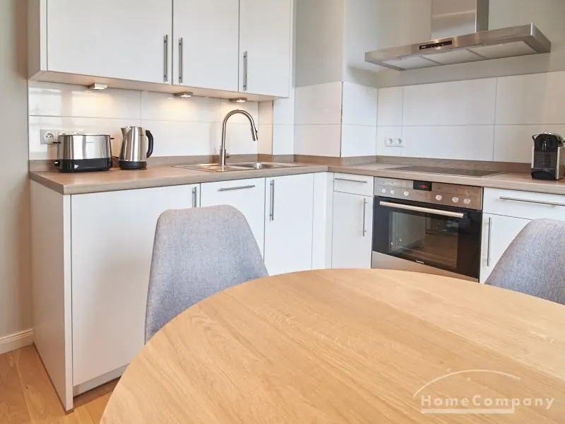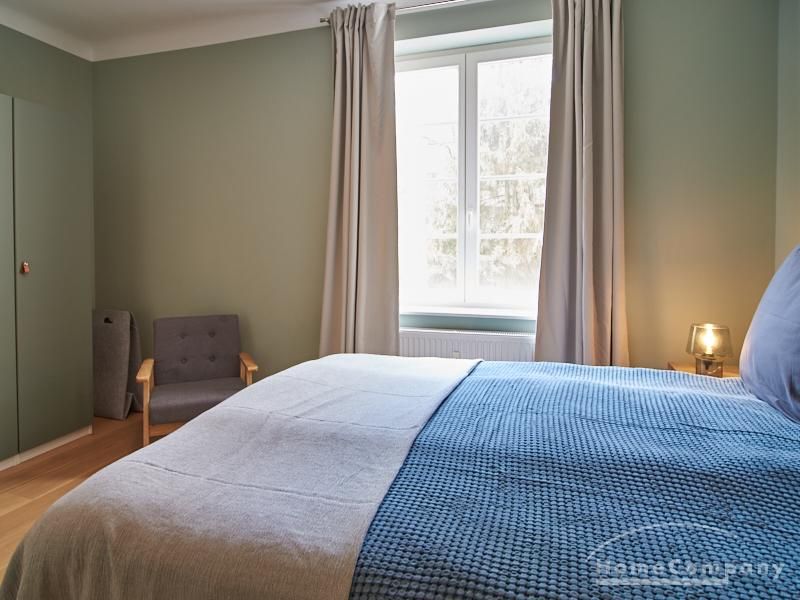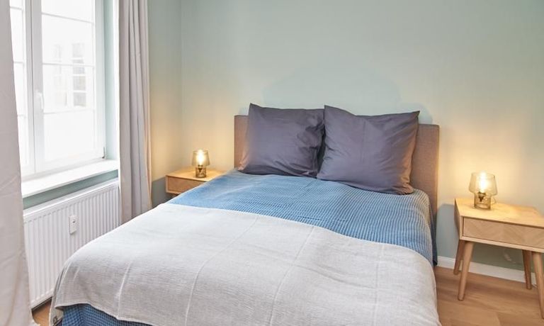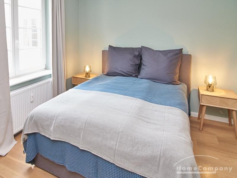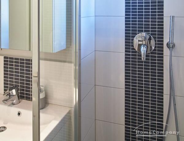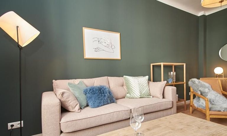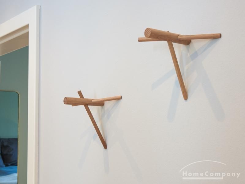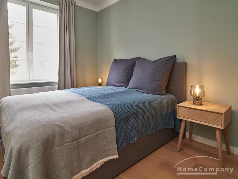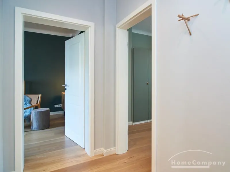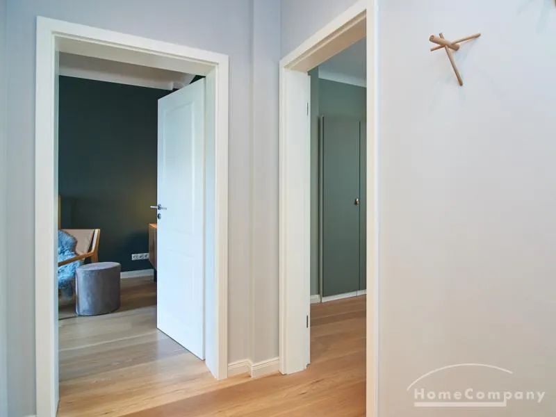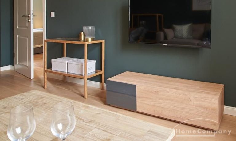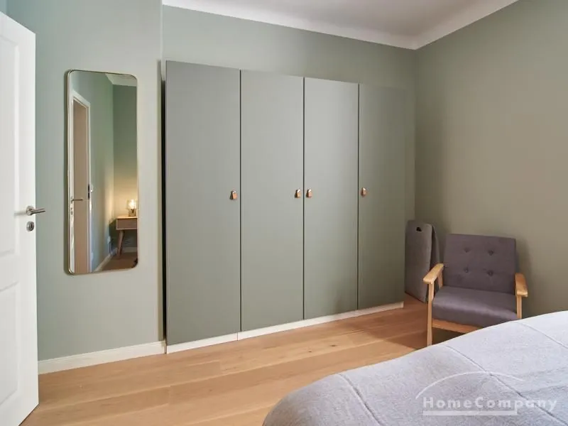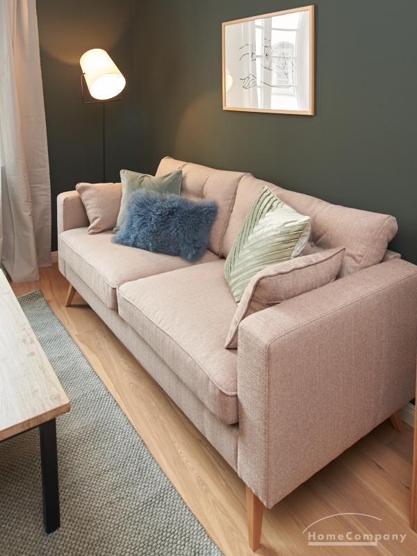 Tief dunkelgrüne Wände im Wohnbereich und rauchig grüne und graue Farben im übrigen Teil der Wohnung kennzeichnen einen unverwechselbaren, modernen Einrichtungsstil. Elegante Möbelstücke, sorgfältig ausgesuchte Accessoires und Elemente in Eichenholz setzen warme und interessante Akzente. Gemütlichkeit wird so mit zeitgemäßem Design vereint und lässt ein modernes und komfortables Wohngefühl entstehen. Im Schlafzimmer befindet sich ein 1,60 m breites Boxspringbett, dass für höchsten Schlafkomfort steht. Ein geräumiger Kleiderschrank und breite Sideboards im Wohnzimmer sorgen für viel Stauraum. Die helle Küche lädt nach Feierabend zum Verweilen ein.