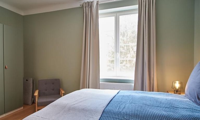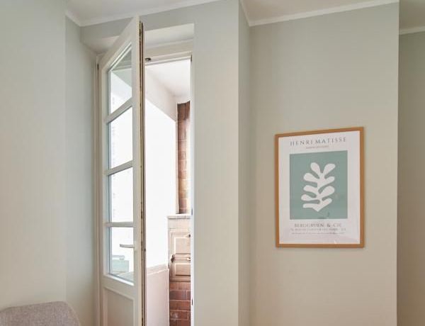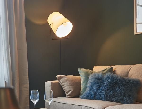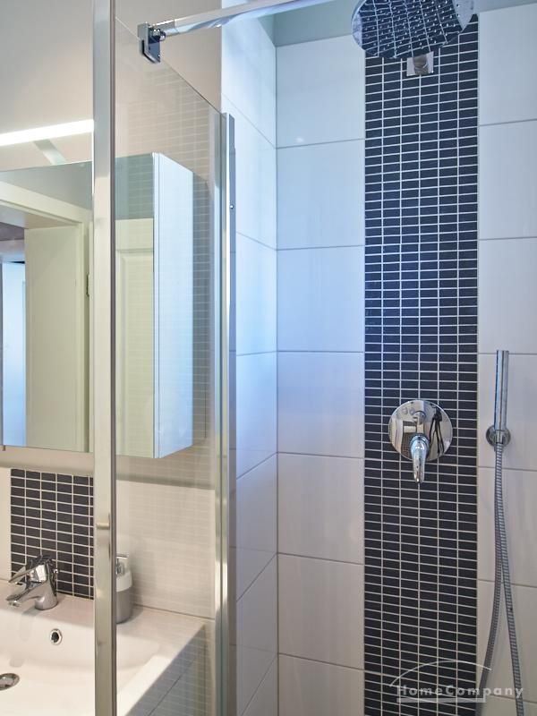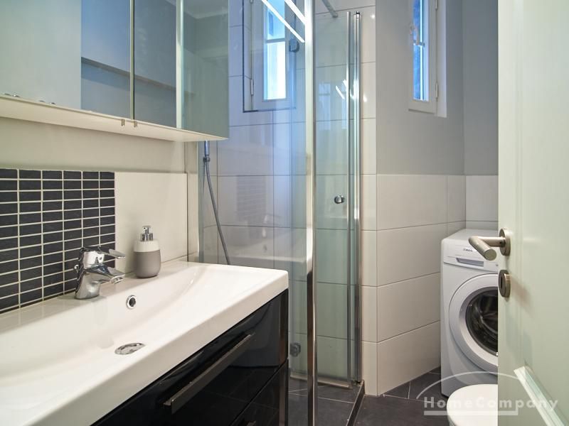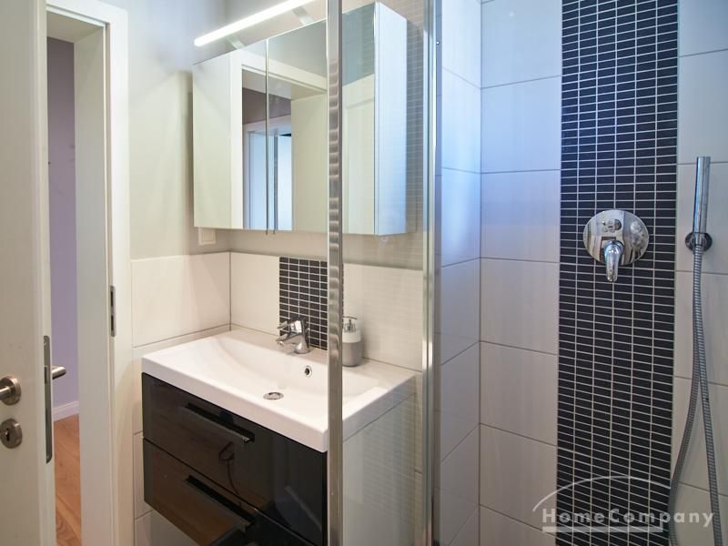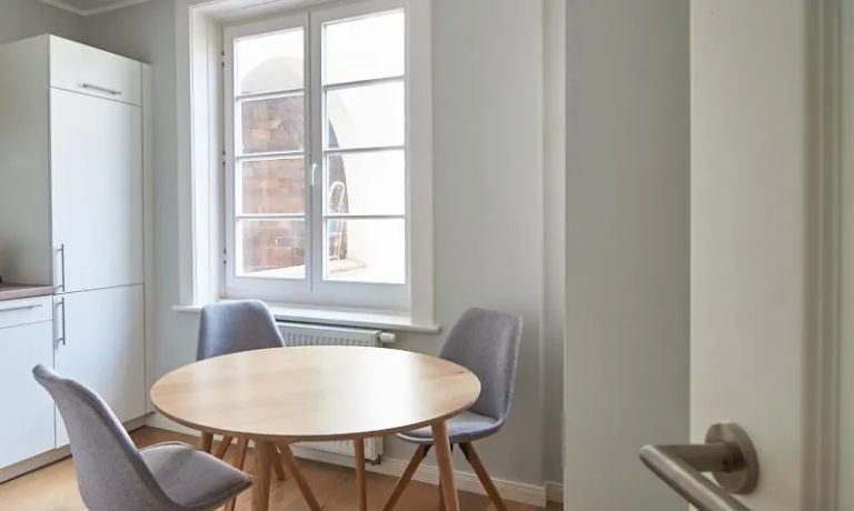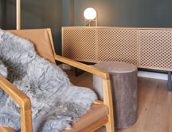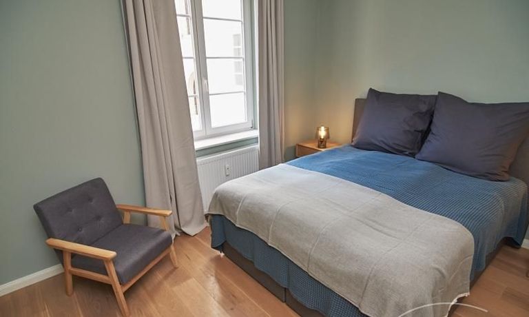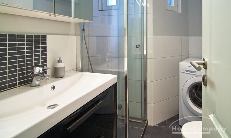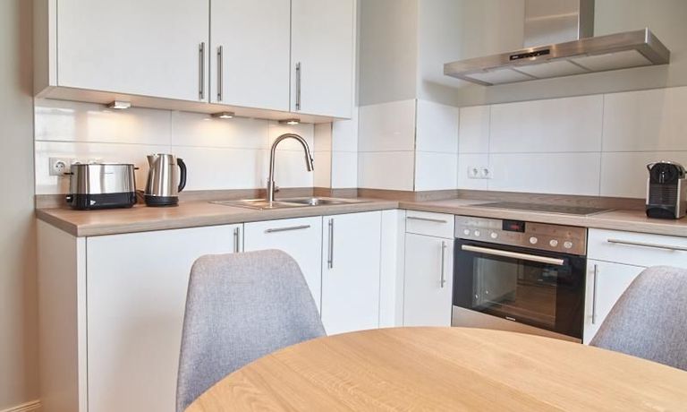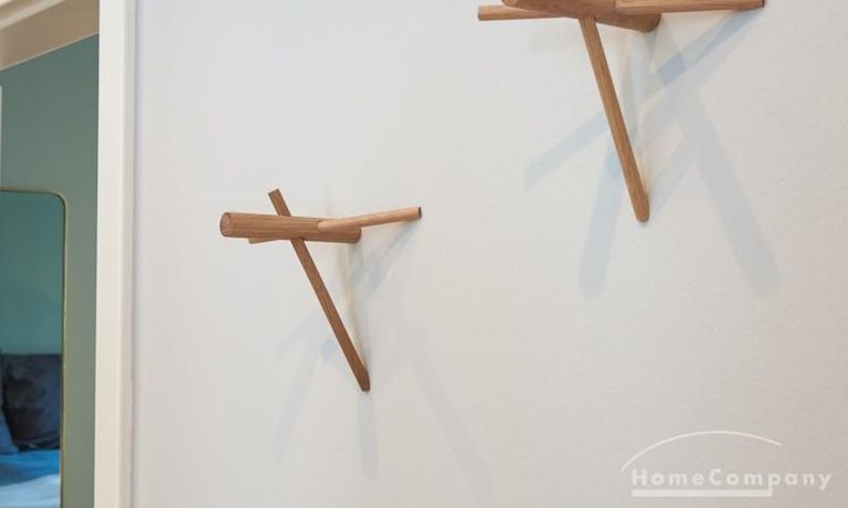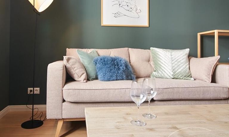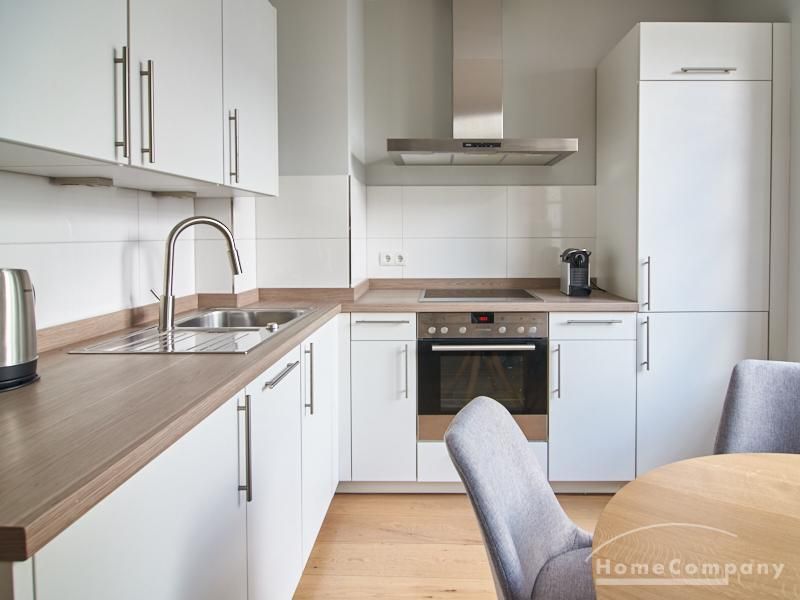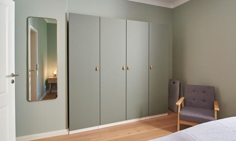 Tief dunkelgrüne Wände im Wohnbereich und rauchig grüne und graue Farben im übrigen Teil der Wohnung kennzeichnen einen unverwechselbaren, modernen Einrichtungsstil. Elegante Möbelstücke, sorgfältig ausgesuchte Accessoires und Elemente in Eichenholz setzen warme und interessante Akzente. Gemütlichkeit wird so mit zeitgemäßem Design vereint und lässt ein modernes und komfortables Wohngefühl entstehen. Im Schlafzimmer befindet sich ein 1,60 m breites Boxspringbett, dass für höchsten Schlafkomfort steht. Ein geräumiger Kleiderschrank und breite Sideboards im Wohnzimmer sorgen für viel Stauraum. Die helle Küche lädt nach Feierabend zum Verweilen ein.