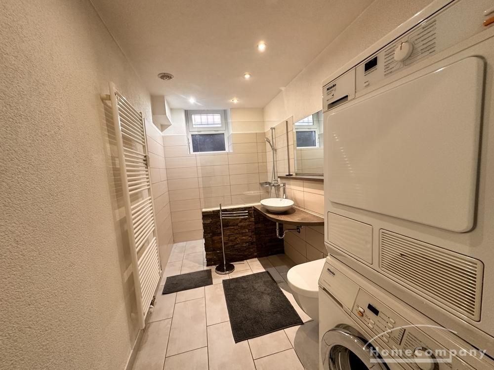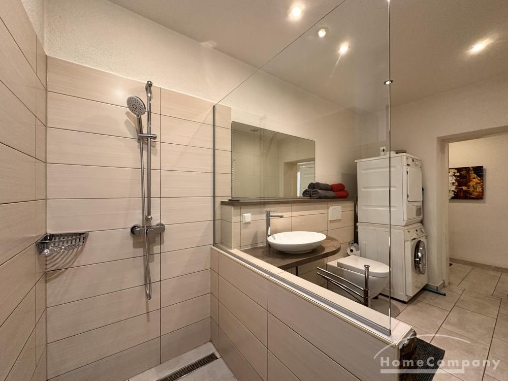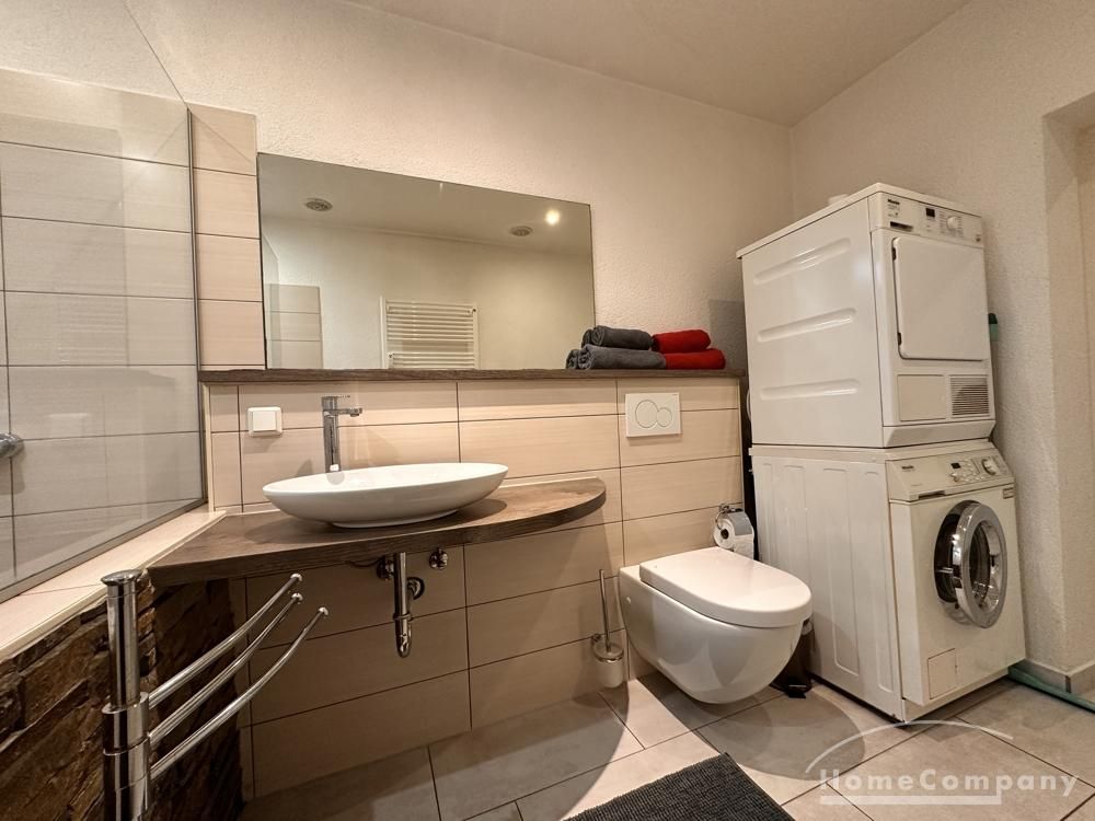 Das Badezimmer verfügt über eine bodengleiche Dusche, Waschbecken, einem WC, einer Waschmaschine und Trockner.
