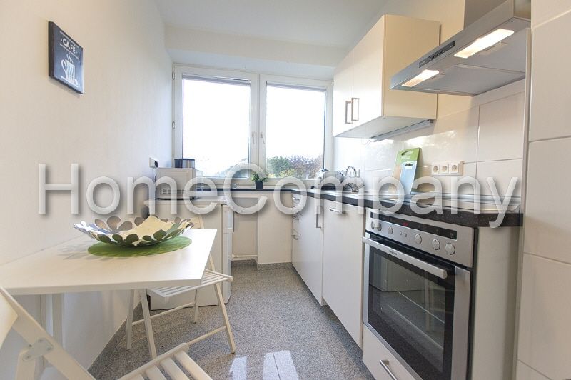 Komplette und moderne Ausstattung, Parkettboden. Beide Räume sind mit Bett bzw. Schlafcouch und Kleiderschrank sowie Flachbild-TV eingerichtet. Bei einer Nutzung durch eine Person oder ein Paar kann einer der Räume gut als Wohnzimmer genutzt werden. Die Küche ist separat und bietet eine weiße Einbauküchenzeile inklusive Ceranherd, Mikrowelle, Spülmaschine, einen Kühlschrank und einen Essplatz für zwei Personen. Ein weiß gefliestes Wannenbad mit Duschvorrichtung gehört zur Wohnung.