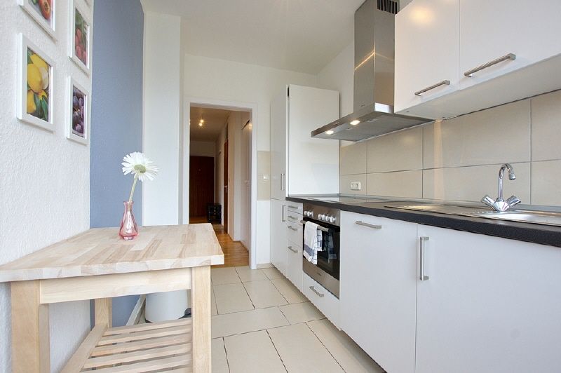 Komplette und moderne Ausstattung. Das Wohnzimmer verfügt über Sofa, Sessel, Lowboard mit TV-Gerät (Kabelanschluss) und einen Arbeitsplatz. Die Küche ist separat und mit einer neuen, weißen Einbauküche und einem Essplatz ausgestattet. Ceranherd mit Dunstabzug, Spülmaschine, Kühlschrank, Gefrierschrank, Kapsel-Kaffeemaschine und Geschirr sind vorhanden. Das Schlafzimmer ist mit einem Doppelbett, Kleiderschrank und Kommoden möbliert. Ein weiß gefliestes Wannenbad mit Duschvorrichtung gehört zur Wohnung. Im Haus stehen eine Gemeinschafts-Waschmaschine und ein Trockner zur Nutzung zur Verfügung.