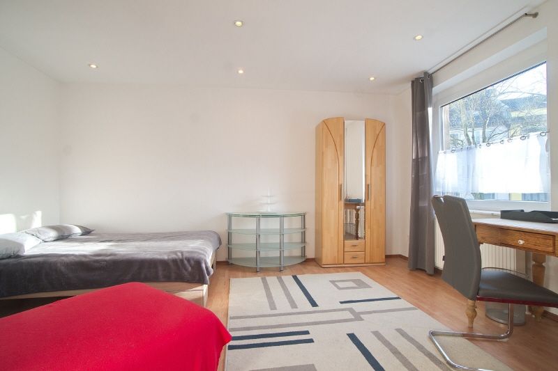 Die gut eingerichtete Wohnung verfügt über einen großzügigen Wohnraum mit einer Schlafcouch, Flachbild-TV mit Sat-Anschluss, einen Arbeitsbereich mit angemeldetem W-Lan-Internetzugang und im hinteren Teil des Raums über eine Schlafmöglichkeit und einen Kleiderschrank. Eine komplett ausgestattete Wohnküche mit Kochfeld/Dunstabzug, Backofen, Kühl-Gefrier-Kombination, Spülmaschine, Geschirr, Besteck etc. ist ebenfalls vorhanden. Ein Essplatz bis zu 4 Personen steht bereit. Hier befindet sich der Zugang zum Balkon mit Blick ins Grüne. Das Schlafzimmer ist mit Boxspringbett (2 x 2m) und großem Kleiderschrank eingerichtet, Badezimmer en Suite mit Eckwanne, Handtuchheizung und Toilette. Ein weiteres, hell gefliestes Bad mit Dusche gehört ebenfalls zur Wohnung. Eine Waschmaschine steht zur alleinigen Nutzung in einem separaten Kämmerchen im Flur zur Verfügung.