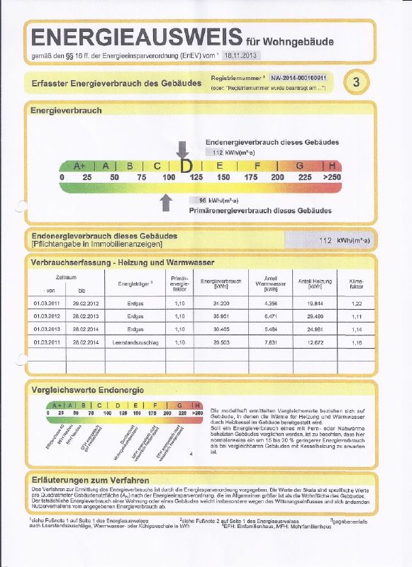 Angaben zum Energieausweis: Baujahr des Hauses: 1925, Wärmeerzeuger 2003, Energieverbrauchsausweis, Wert: 112 kWh/(m²a), Energieträger: Erdgas.