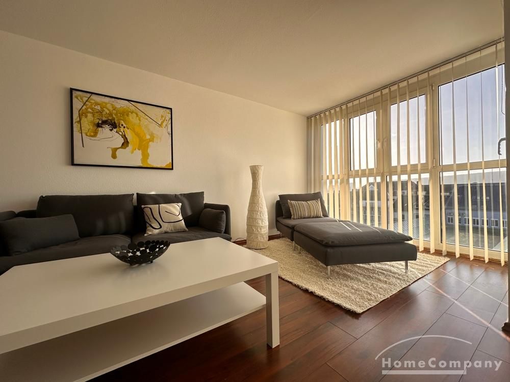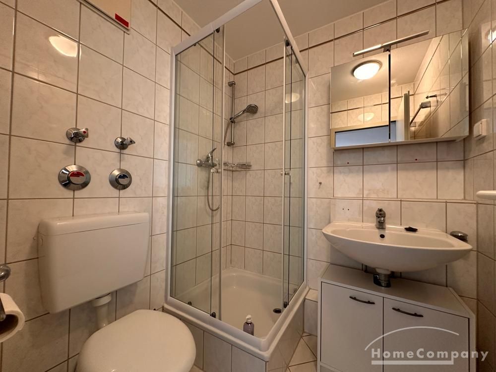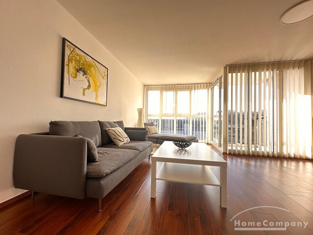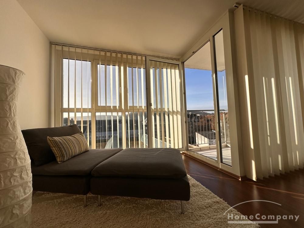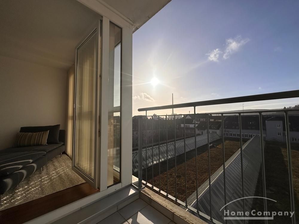 Ein Balkon mit Blick über die Dächer lädt zum Verweilen ein. Die Einbauküche ist ausgestattet mit Backofen, Cerankochfeld, Geschirrspülmaschine, Kühl-, Gefrierschrank und den notwendigen Küchenutensilien, sowie Geschirr, Besteck und Gläser.