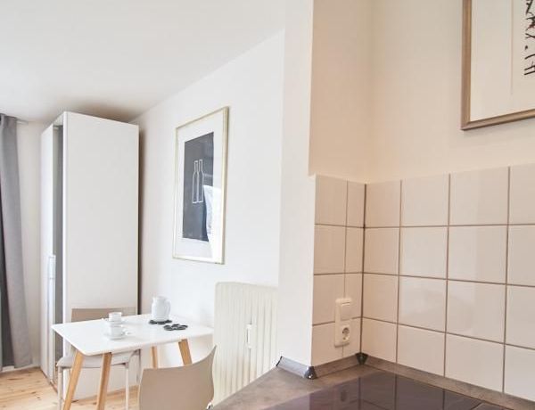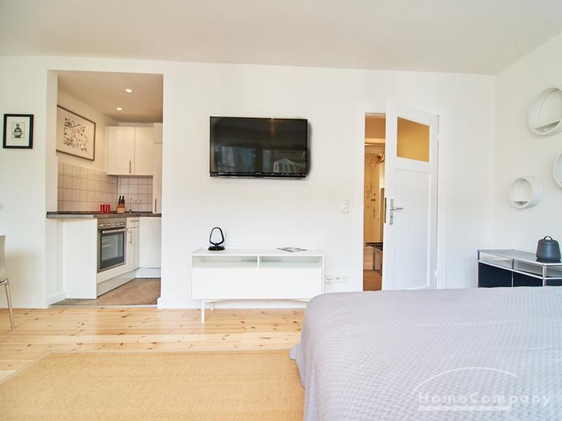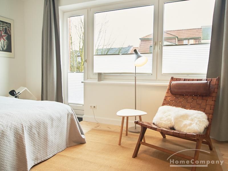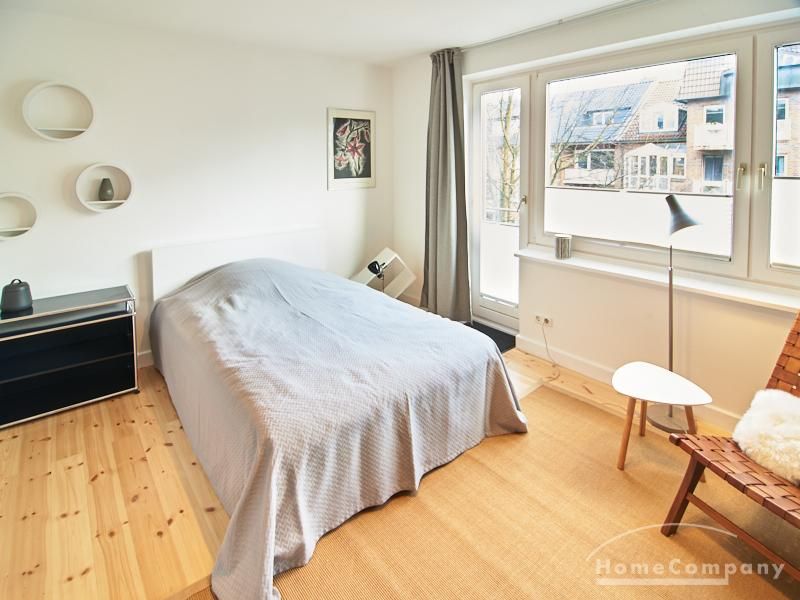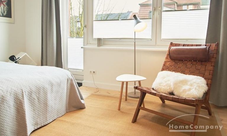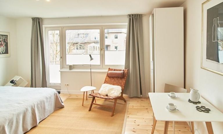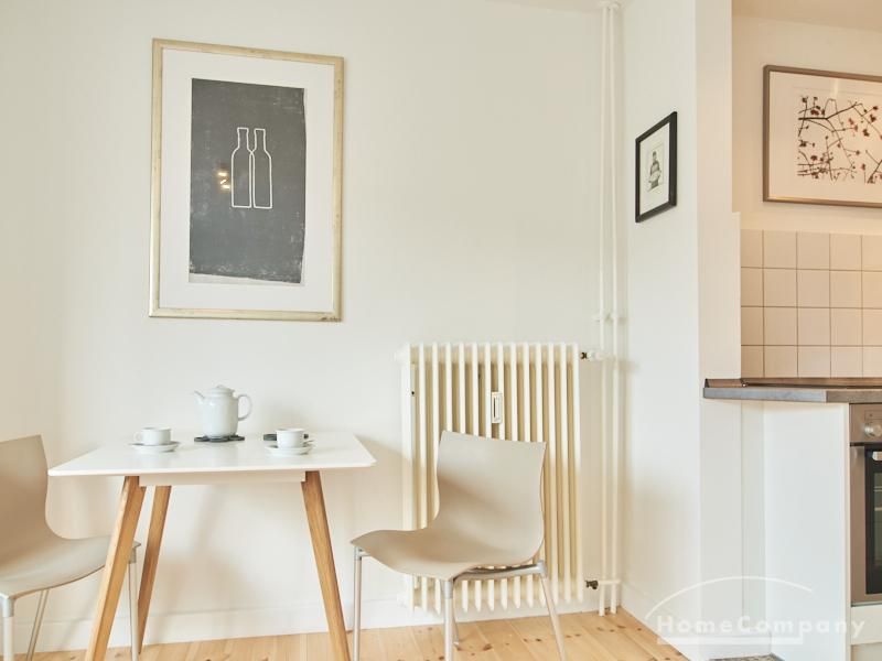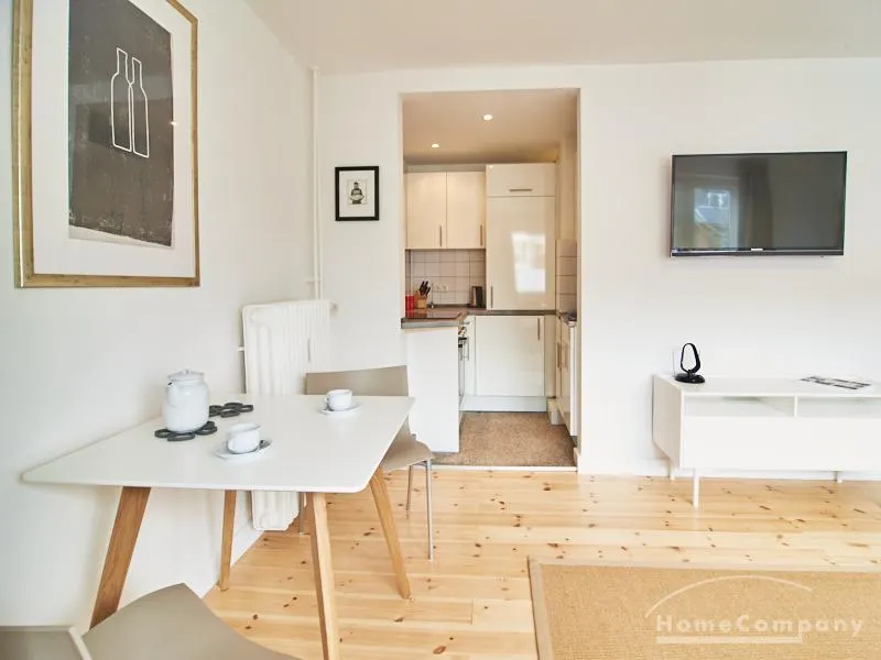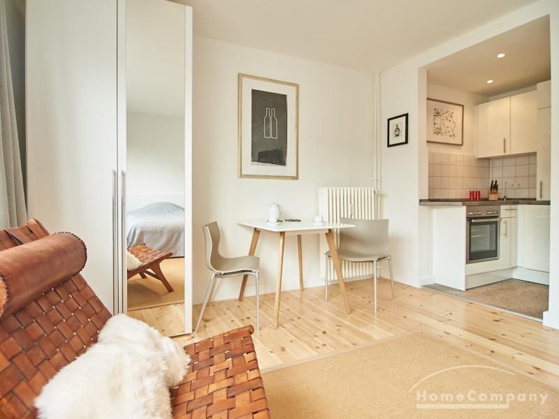 Modern eingerichtetes Apartment in schöner ruhiger Lage in Eimsbüttel. Die Einrichtung ist modern und geschmackvoll in hellen, frischen Farben gehalten. Die sehr sorgfältige Ausstattung lässt keine Wünsche offen. Eine kleine Musikanlage ist in ein Phonomöbel integriert. Die Küche ist zum Wohnbereich hin offen. Hier steht ein Tisch für bis zu vier Personen bereit.