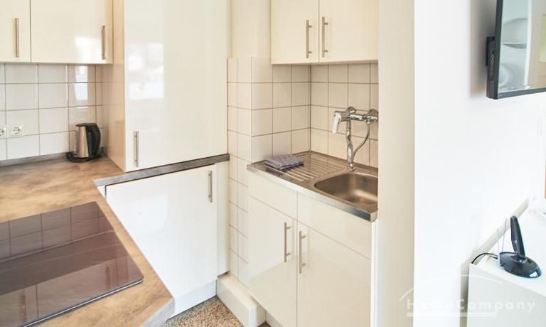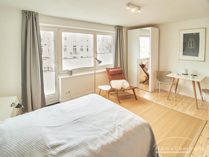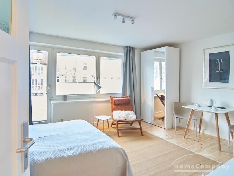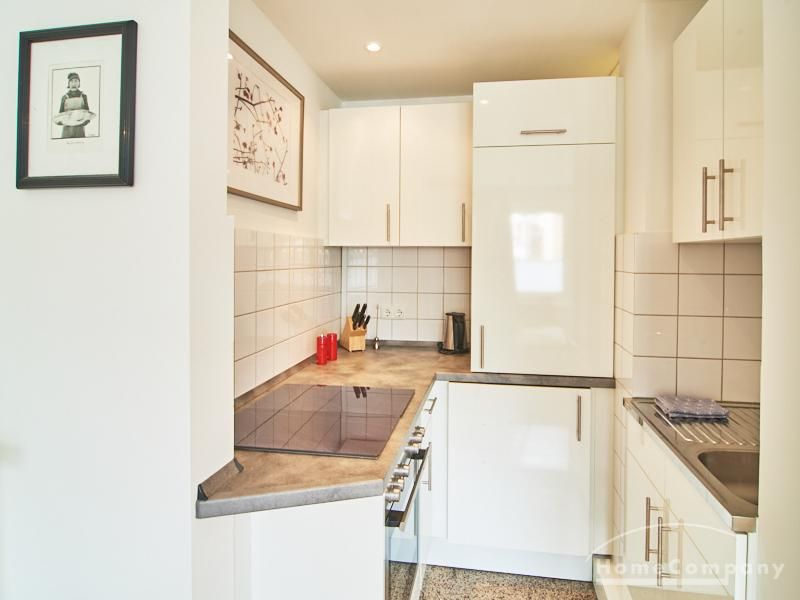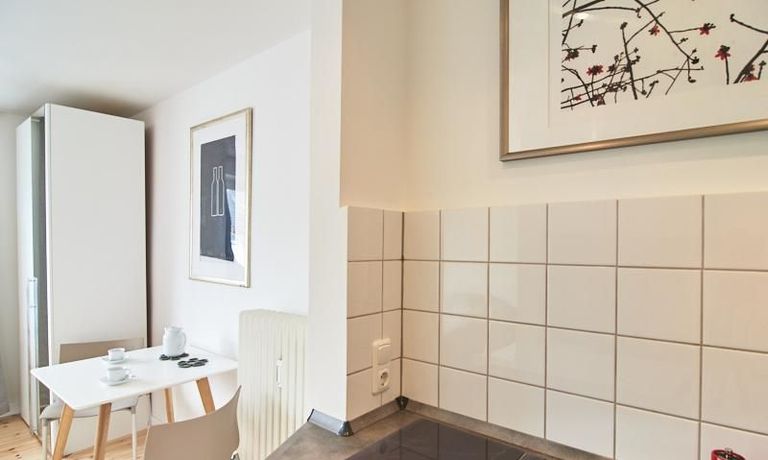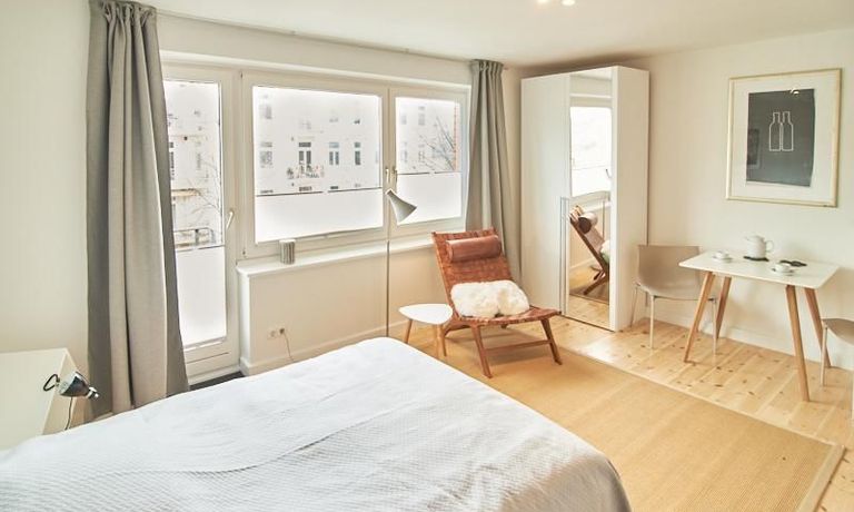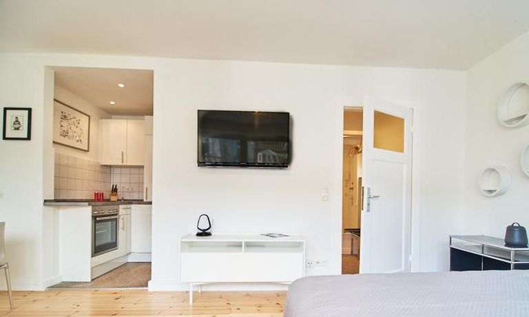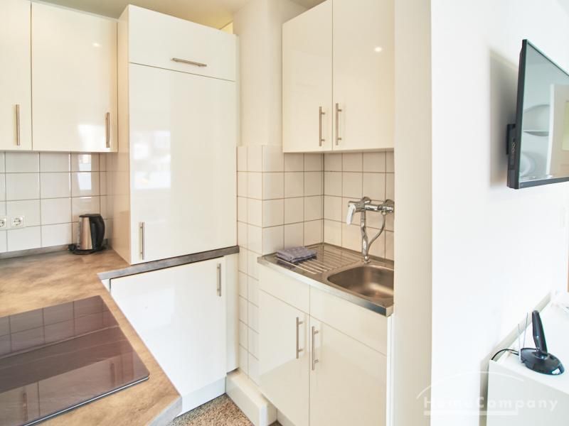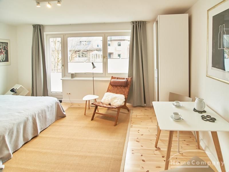 Modern eingerichtetes Apartment in schöner ruhiger Lage in Eimsbüttel. Die Einrichtung ist modern und geschmackvoll in hellen, frischen Farben gehalten. Die sehr sorgfältige Ausstattung lässt keine Wünsche offen. Eine kleine Musikanlage ist in ein Phonomöbel integriert. Die Küche ist zum Wohnbereich hin offen. Hier steht ein Tisch für bis zu vier Personen bereit.