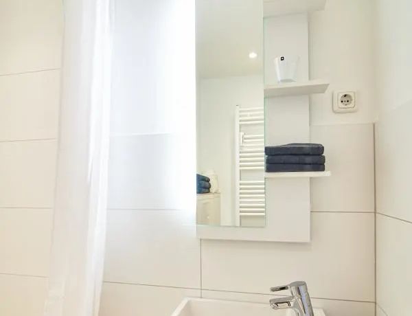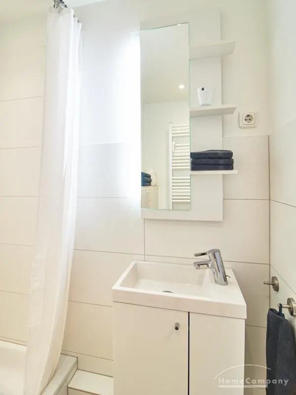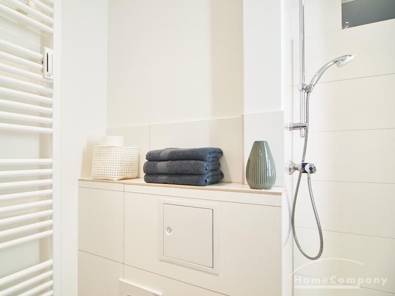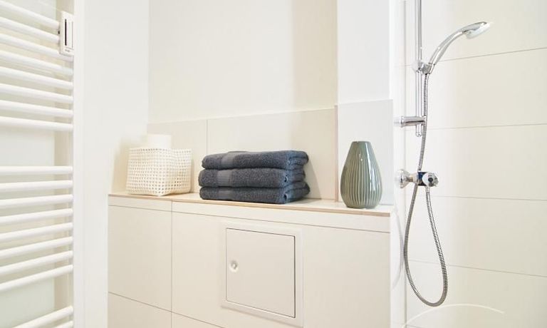 Das Duschbad ist frisch und hell gefliest und komfortabel ausgestattet.