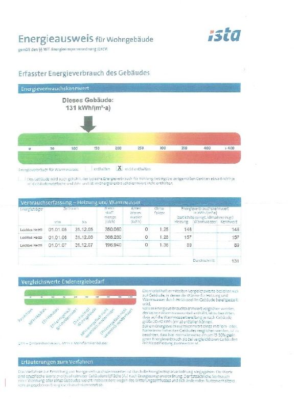 Angaben zum Energieausweis: Baujahr des Hauses: 1962, Anlagentechnik 2006, Energieverbrauchsausweis, Wert: 131, Energieträger: Heizöl.
