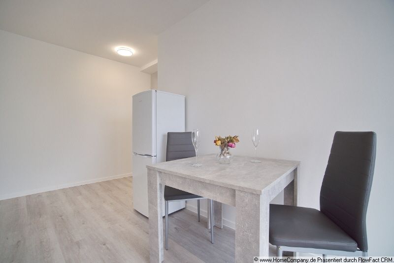 Die Wohnung ist voll möbliert und modern ausgestattet – ideal für einen sofortigen Einzug. Das Wohnzimmer bietet eine gemütliche Couch, einen Esstisch mit Stühlen, ein Sideboard sowie einen Fernseher mit Smart-Funktion. Von hier aus gelangen Sie direkt auf den Balkon, der mit Sitzmöbeln ausgestattet ist. Ein großer Kühlschrank ist ebenfalls im Raum integriert. Die Küche verfügt über ein modernes Zweier-Induktionsfeld, eine Kaffeemaschine sowie eine Mikrowelle mit Backofenfunktion. Das Schlafzimmer ist mit einem komfortablen Bett (1,40 × 2 m) und einem geräumigen Kleiderschrank eingerichtet. Von hier aus erreicht man die separate Toilette. Das Duschbad befindet sich in einem eigenen Raum. Bei Bedarf kann der Vermieter zusätzliche Einrichtungsgegenstände bereitstellen. Eine Waschmaschine kann nach Absprache ebenfalls zur Verfügung gestellt werden, alternativ stehen Münzwaschmaschinen im Keller zur Nutzung bereit. Ein Internetzugang ist im Mietpreis enthalten.
