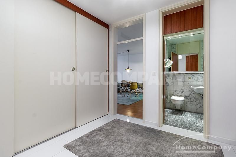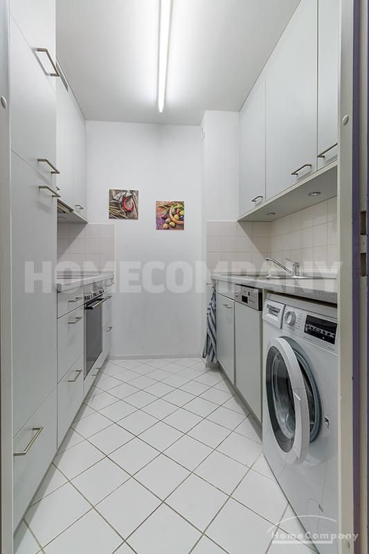 Weiß gefliester Eingangsbereich mit Spiegel und Einbauschrank. Das helle Badezimmer ist mit einer Badewannen-Dusch-Kombination ausgestattet. Das modern eingerichtete Wohnzimmer verfügt über ein großes Sofa, einen Esstisch mit Platz für 4 Personen, sowie ein Sideboard mit einem Flat Screen. Die angrenzende Einbauküche ist mit einer Spülmaschine, einem Backofen, einer Waschmaschine, sowie diversen Küchenutensilien ausgestattet die man für den täglichen Bedarf benötigt. Das Schlafzimmer ist mit einem Vorhang vom Wohnzimmer getrennt und verfügt über ein Doppelbett und einen kleinen Platz zum Arbeiten. Duplexstellplatz ist inklusive. Lift vorhanden. Geschäfte des täglichen Bedarfs sind fußläufig erreichbar.