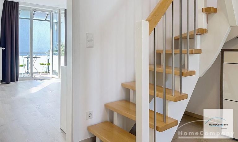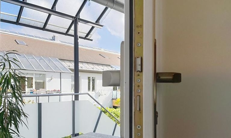 Der 1998 gebaute und gut isolierte Gebäudekomplex wurde vor ein paar Jahren mit einem neuen Außenwand- und Geländer-Anstrich renoviert. Die im 1. Stock liegende Maisonetten-Wohnung mit Dachgeschoß besticht durch eine einzigartige Architektur mit einer Verglasung im Dachfirst. Diese lässt die Wohnung mit hellem Tages-Licht durchfluten.