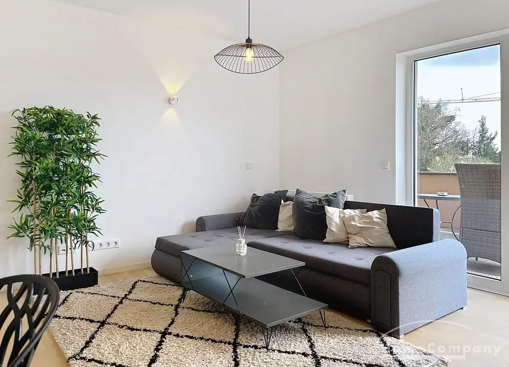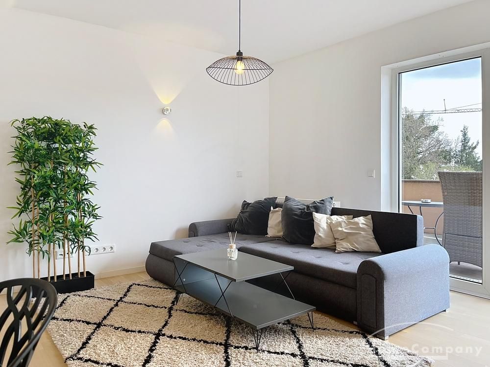 Das Herzstück der Wohnung ist das großzügige Wohnzimmer mit einem großen südlich ausgerichteten Panoramafenster, das sich komplett öffnen lässt. So entsteht ein offenes Wohngefühl mit Blick ins Grüne und direktem Zugang zur umlaufenden Dachterrasse mit LED-Beleuchtung – ideal zum Grillen oder Entspannen nach einem langen Arbeitstag.
