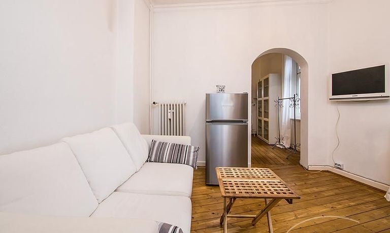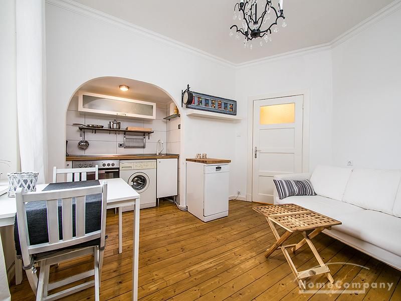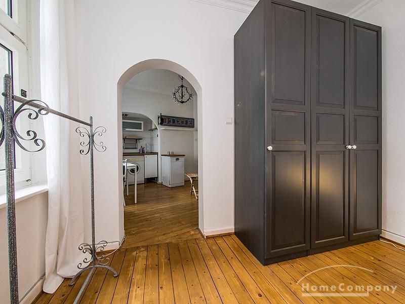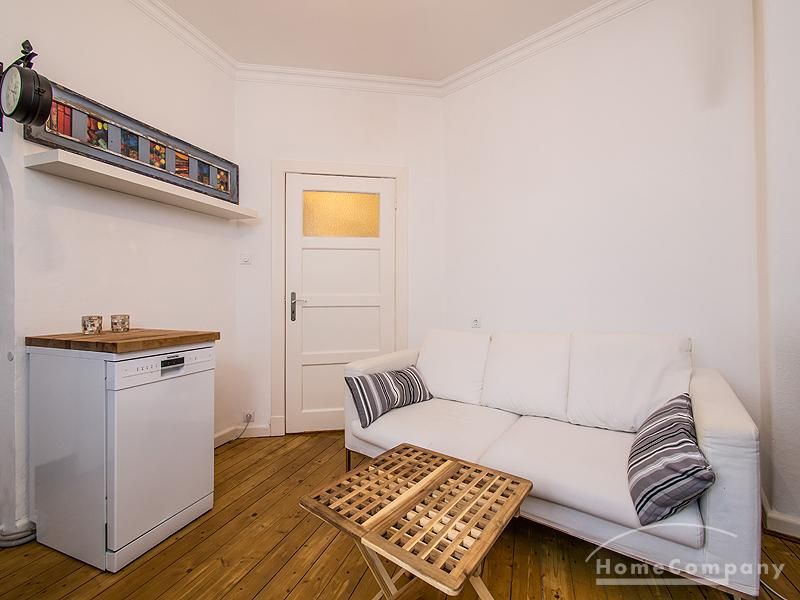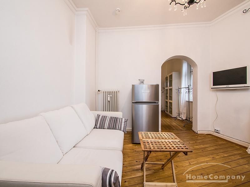 Die 2-Zimmer-Wohnung liegt im 1. OG eines gepflegten und renovierten Altbaus. Zwischen dem Haus und der Straße liegt eine gepflegte kleine Grünanlage mit einem Fußgängerüberweg, der zum Eingang des Hauses führt. Die Wohnräume sind mit Stuck verziert. Alle Zimmer, bis auf das Bad, sind mit einem schönen Holzdielenfußboden ausgestattet. Der kleine Schlaf- und Arbeitsraum ist durch einen offenen Türbogenrundgang mit dem Wohnzimmer verbunden, in dem sich eine Wohnküche befindet. Die Wohnung wurde 2011 aufwendig und komplett renoviert. Das Duschbad wurde vollständig saniert und mit ausgewählten Elementen modern und stilvoll eingerichtet.