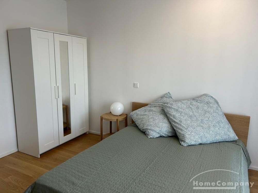 Der optisch abgetrennte Schlafbereich ist mit einem Doppelbett und einem Kleiderschrank möbliert. Das Badezimmer verfügt über eine moderne Dusche.