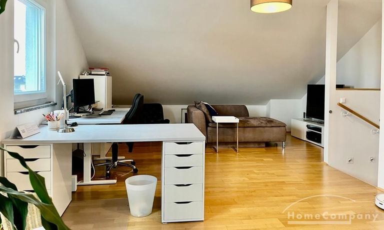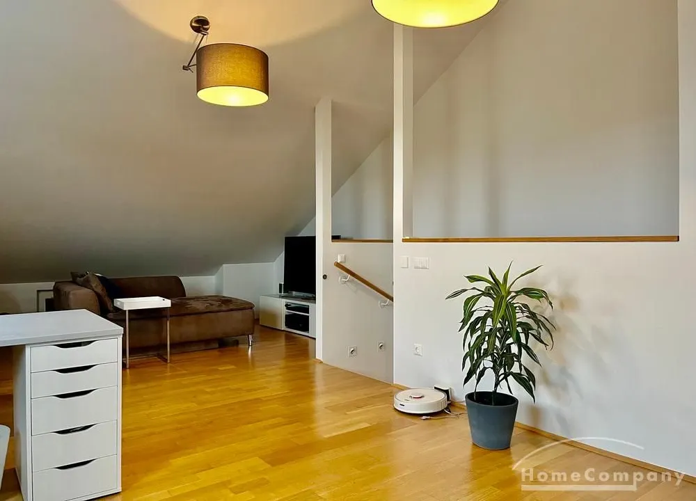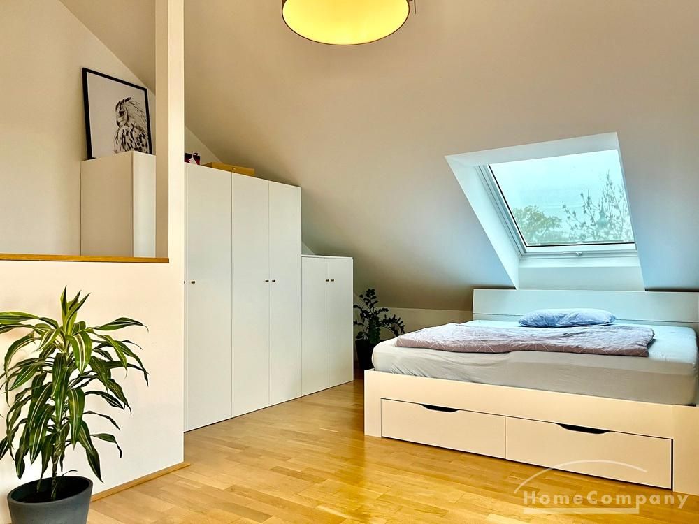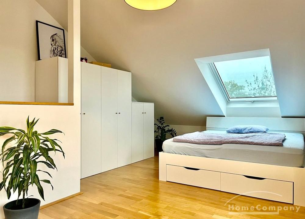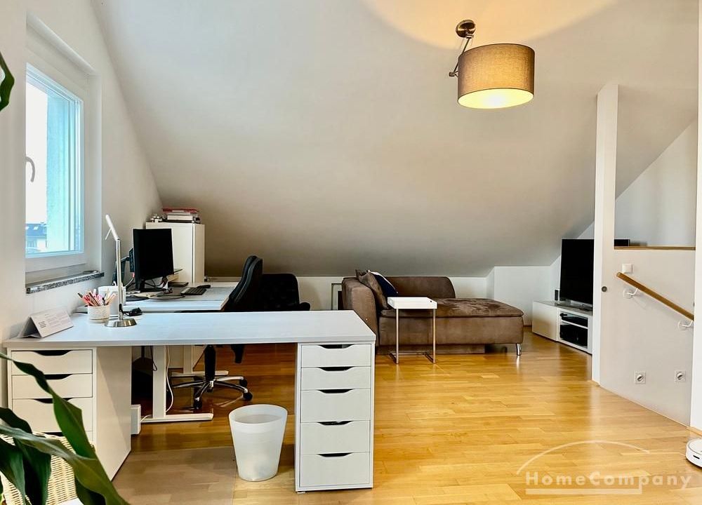 Das Galeriezimmer im Dachgeschoss, das offen und lichtdurchflutet gestaltet ist, bietet Platz für ein gemütliches Hauptschlafzimmer, das durch einen integrierten Arbeitsbereich und ein Sofa abgerundet wird – der perfekte Rückzugsort.