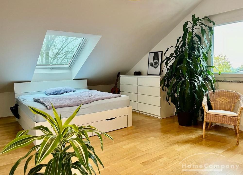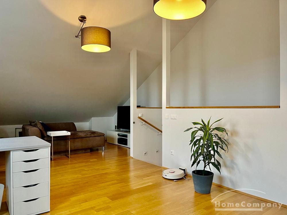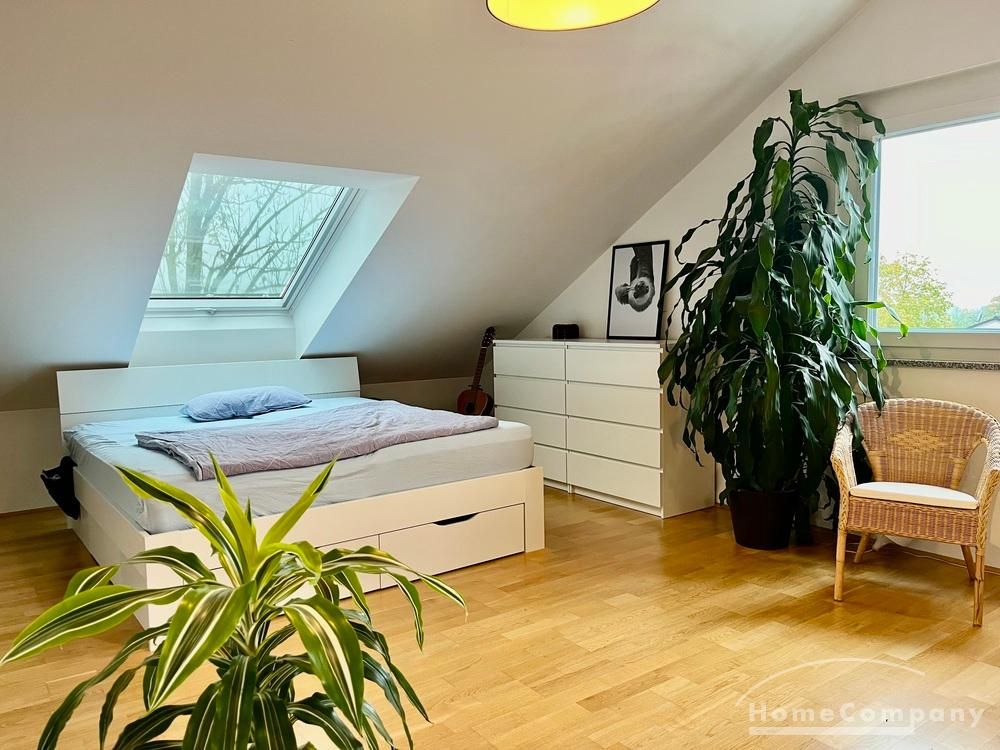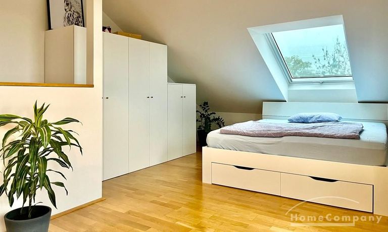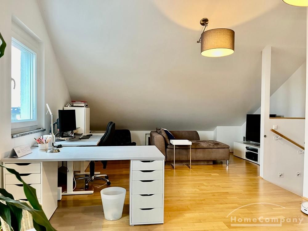 Das Galeriezimmer im Dachgeschoss, das offen und lichtdurchflutet gestaltet ist, bietet Platz für ein gemütliches Hauptschlafzimmer, das durch einen integrierten Arbeitsbereich und ein Sofa abgerundet wird – der perfekte Rückzugsort.