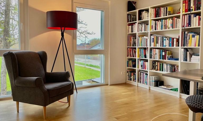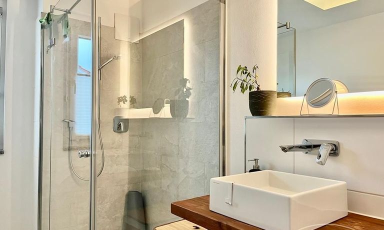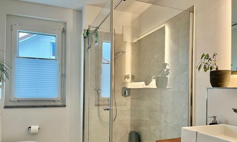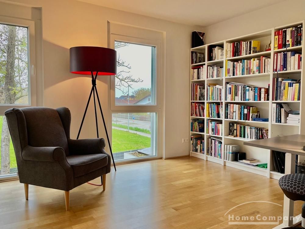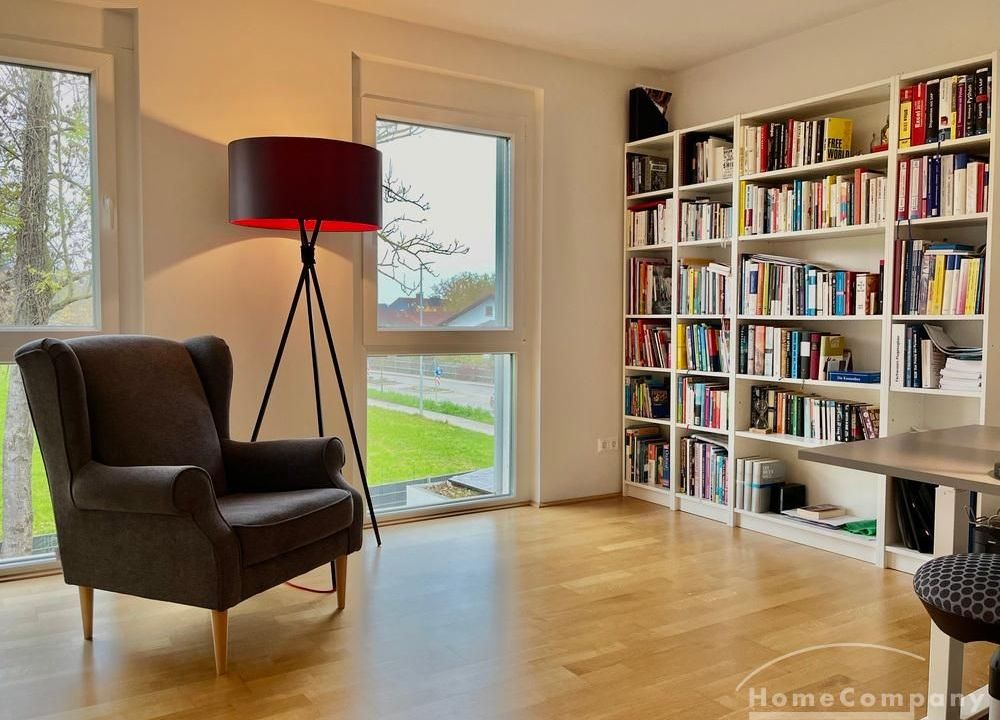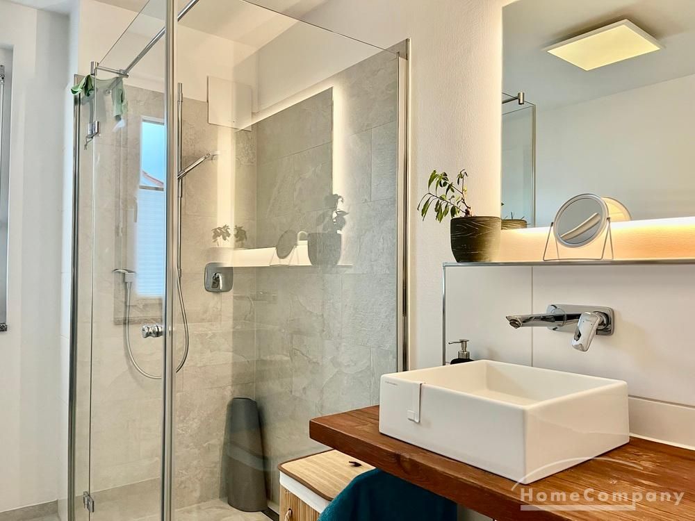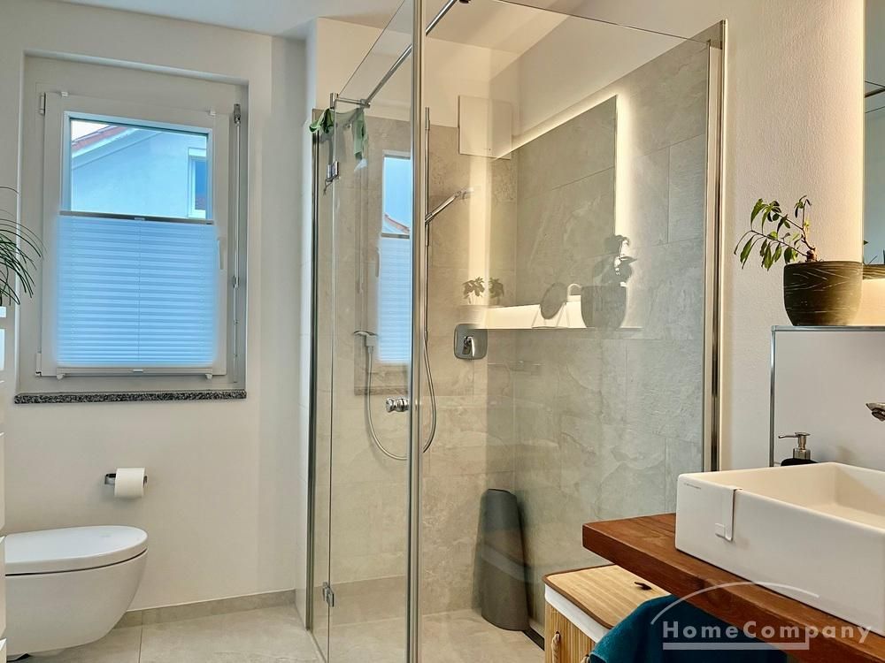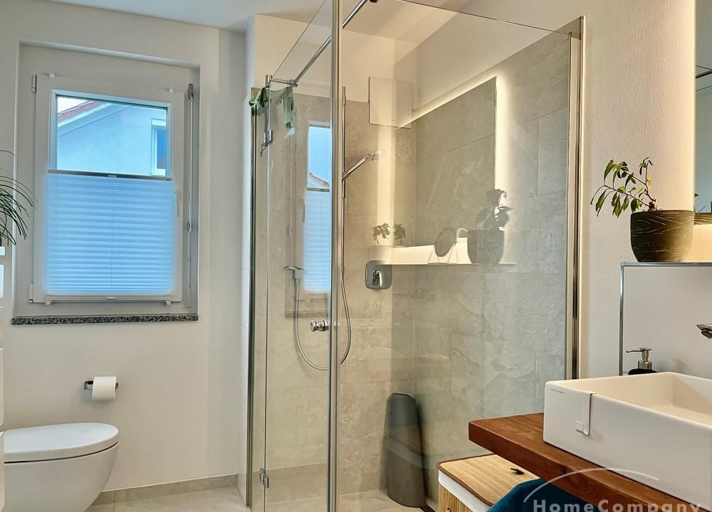 Das 1. Obergeschoss beherbergt ein vielseitig nutzbares Arbeitszimmer, ein Gästezimmer mit begehbarem Kleiderschrank sowie ein modernes Bad mit einer bodentiefen Dusche, das höchste Ansprüche an Design und Funktionalität erfüllt.