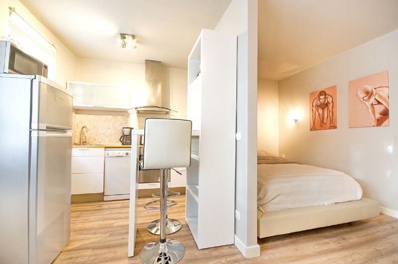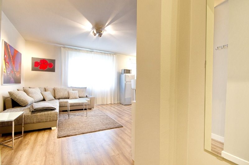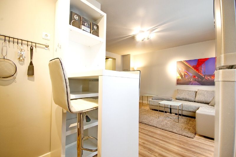 Komplett neue, sehr moderne Einrichtung und Ausstattung, Laminatboden. Großer Wohnraum mit abgeteiltem Schlafbereich (Doppelbett). Essbereich mit Bar und zwei Hockern, eine Single-Einbauküche inklusive Spülmaschine, Kühl-Gefrier-Kombination usw. steht zur Verfügung. Der Wohnbereich bietet ein großes Ecksofa zum Relaxen und einen Flatscreen-Fernseher. Blick in das Grün des Innenhofes. Ein Kleiderschrank befindet sich in der Eingangsdiele des Apartments. Das neue Duschbad ist geschmackvoll gestaltet. Bettwäsche und Handtücher werden gestellt. Eine Waschmaschine im Keller steht den Mieter zur Nutzung zur Verfügung.