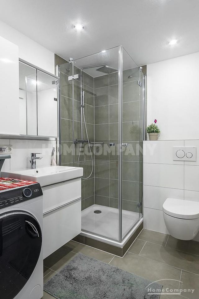 Das moderne Badezimmer bietet eine große Dusche und eine Wasch-Trocken-Kombination.